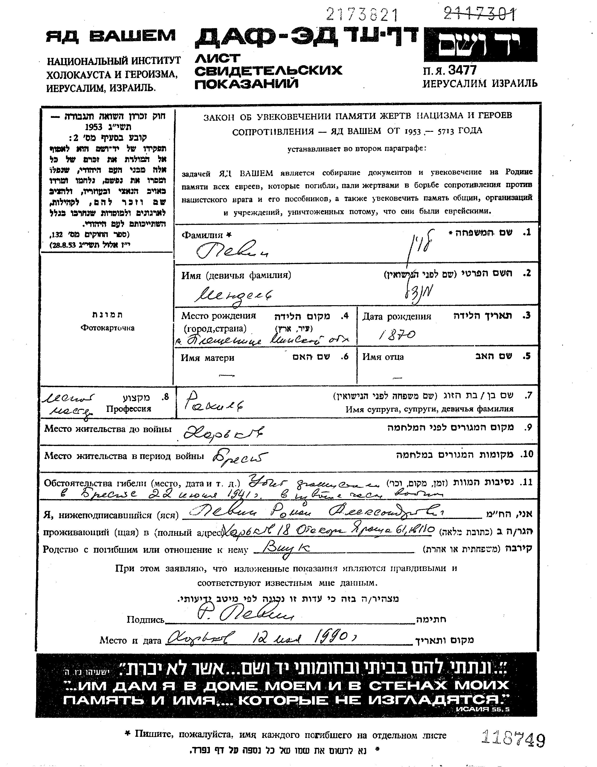 Mendel wurde in der Schoah ermordet. Todesort: Brest, Polen im Jahr 22/06/1941.