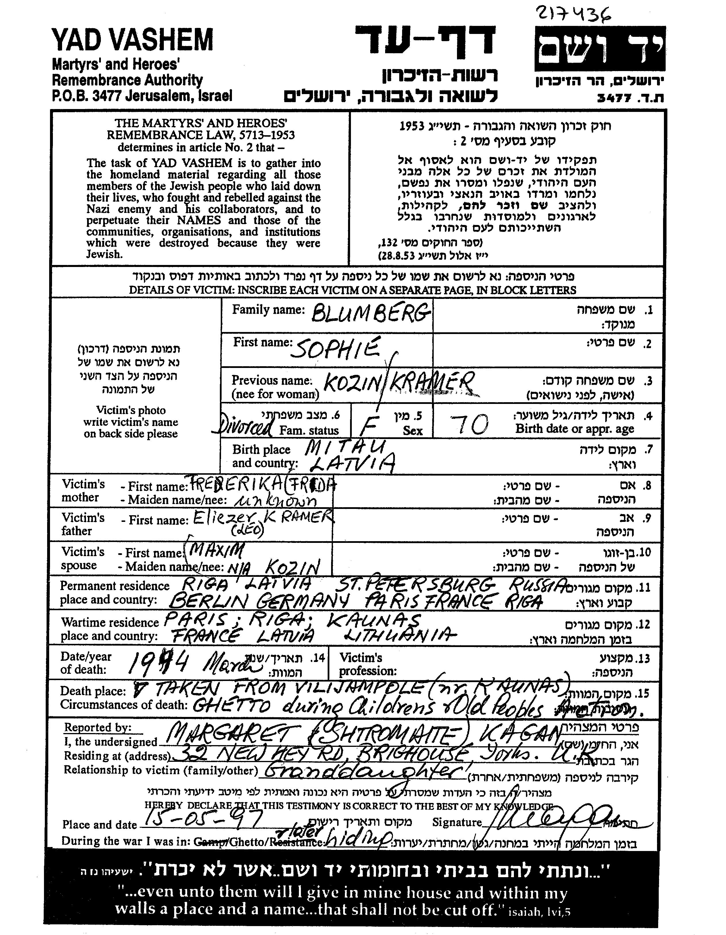 Sophie Blumberg, geb. Kremer wurde in Mitau, Lettland geboren. Sie war die Tochter von Eliezer Leo und Frederika Frida. Sie war Verheiratet. Vor dem Zweiten Weltkrieg lebte sie in Paris, Frankreich. Während des Krieges war sie in Kaunas, Litauen.