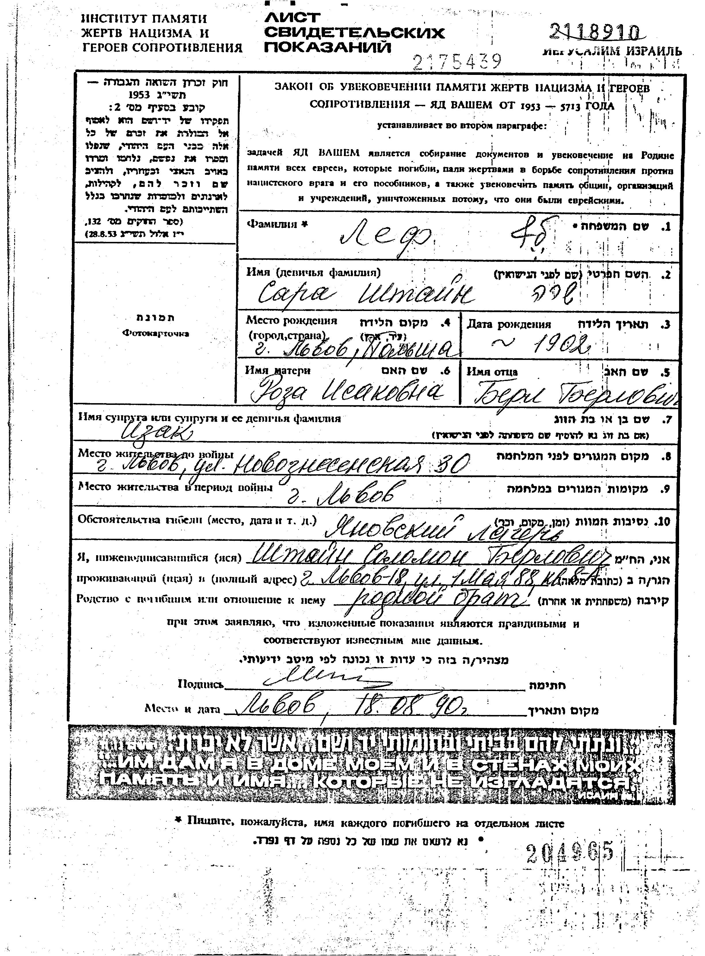 Sara Lef, geb. Shtain wurde im Jahr 1902 in Lwow, Polen geboren. Sie war die Tochter von Berl und Roza. Sie war mit Izak Verheiratet. Vor dem Zweiten Weltkrieg lebte sie in Lwow, Polen. Während des Krieges war sie in Lwow, Polen.