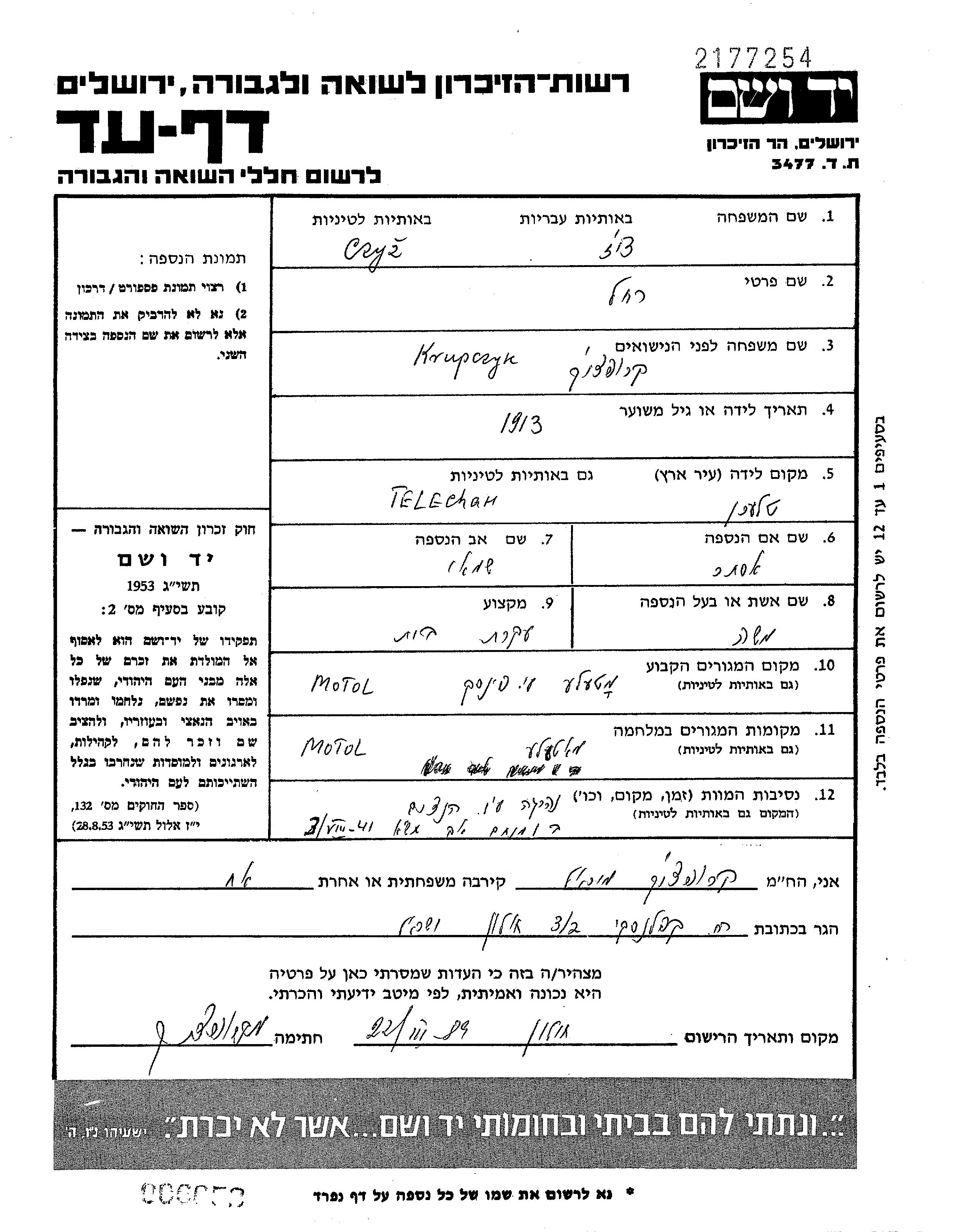 Rakhel Czyz, geb. Krupczyk wurde im Jahr 1913 in Telechany, Polen geboren. Sie war die Tochter von Shamai und Ester. Sie war Hausfrau und mit Moshe Verheiratet. Vor dem Zweiten Weltkrieg lebte sie in Motol, Polen. Während des Krieges war sie in Motol, Polen.