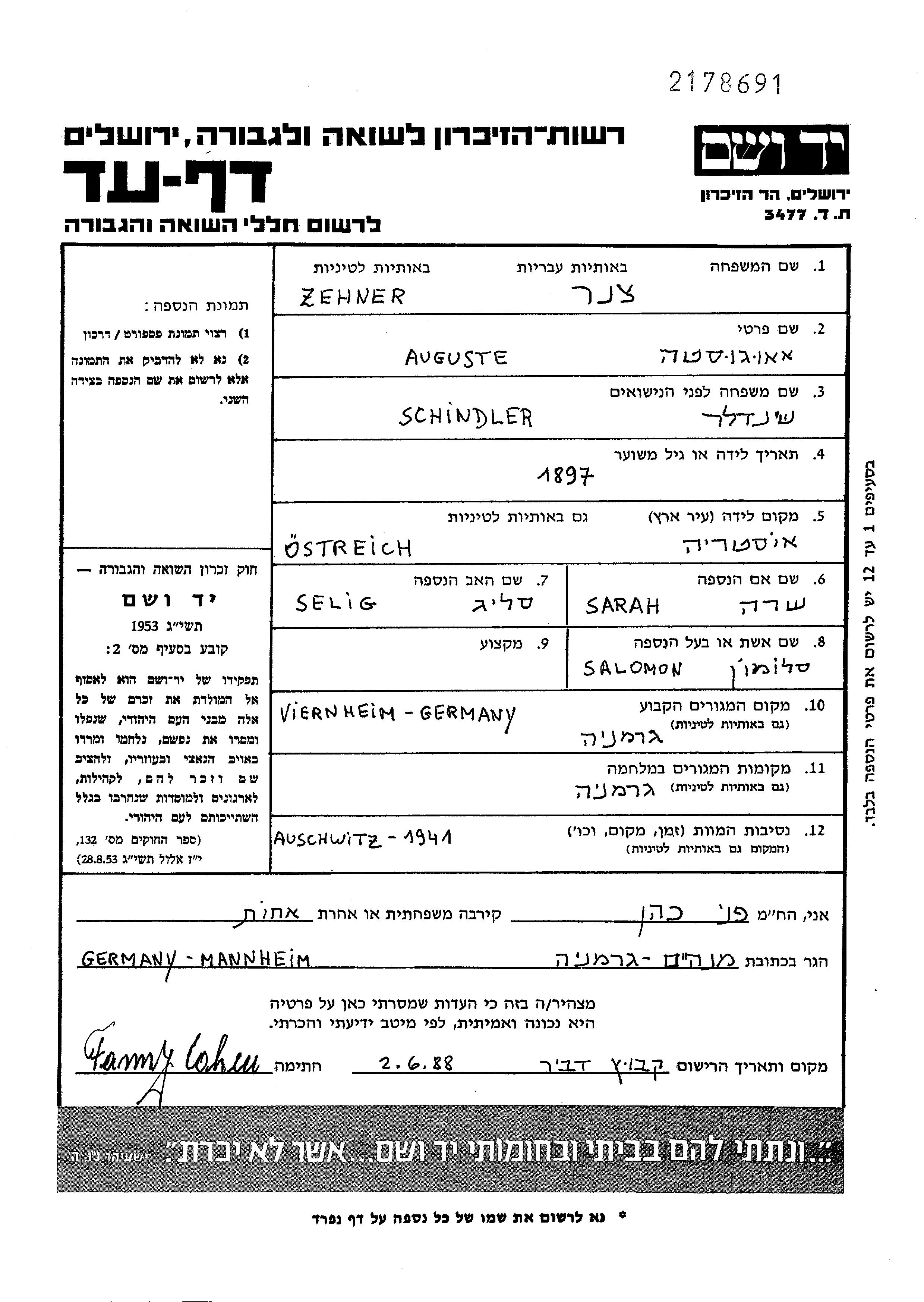 Auguste Augusta Zehner, geb. Schindler wurde im Jahr 1897 in Österreich geboren. Sie war die Tochter von Selig und Sara. Sie war mit Salomon Verheiratet. Vor dem Zweiten Weltkrieg lebte sie in Viernheim, Deutsches Reich. Während des Krieges war sie in Deutsches Reich.