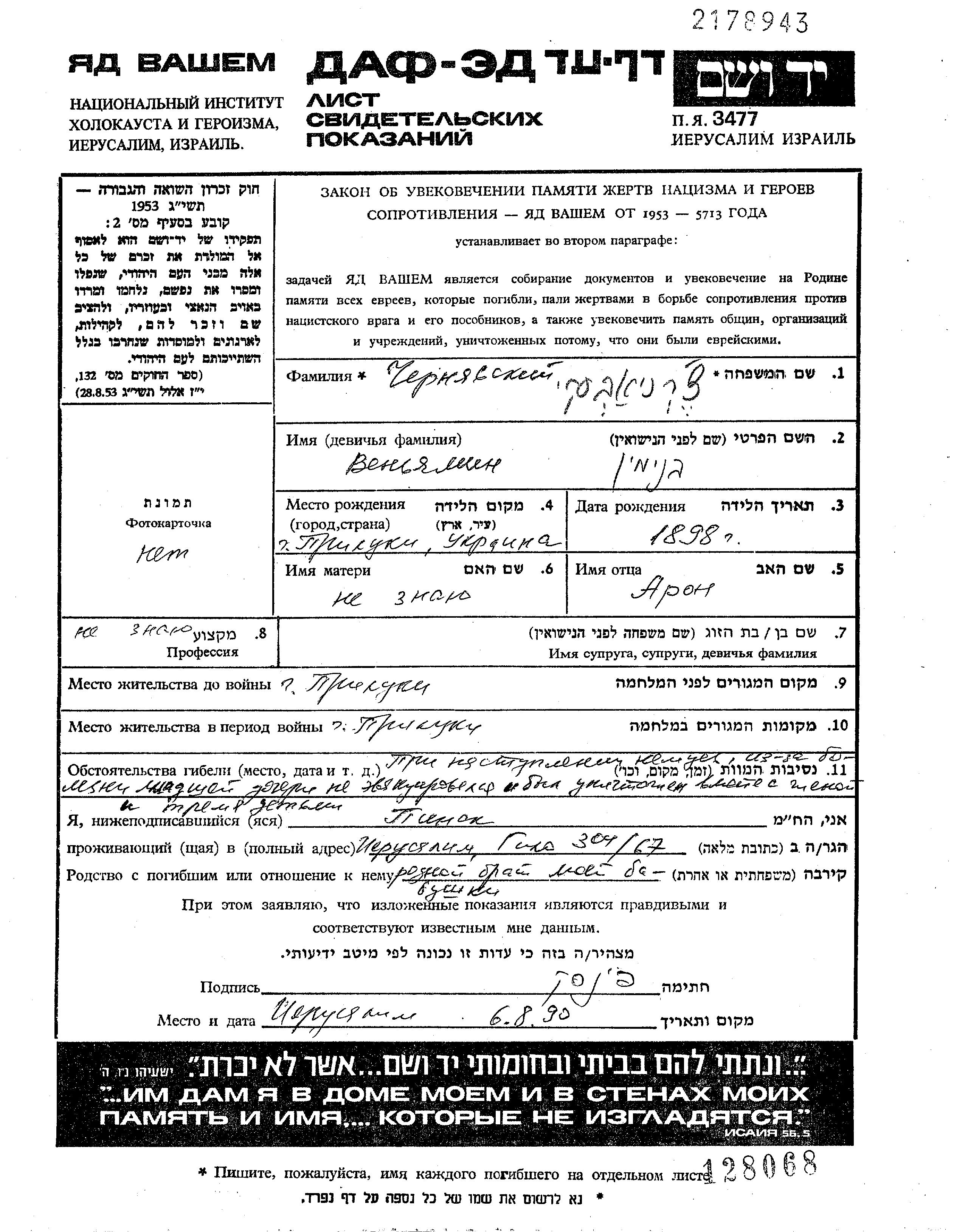 Venyamin wurde in der Schoah ermordet. Todesort: Priluki, Ukraine (UdSSR).