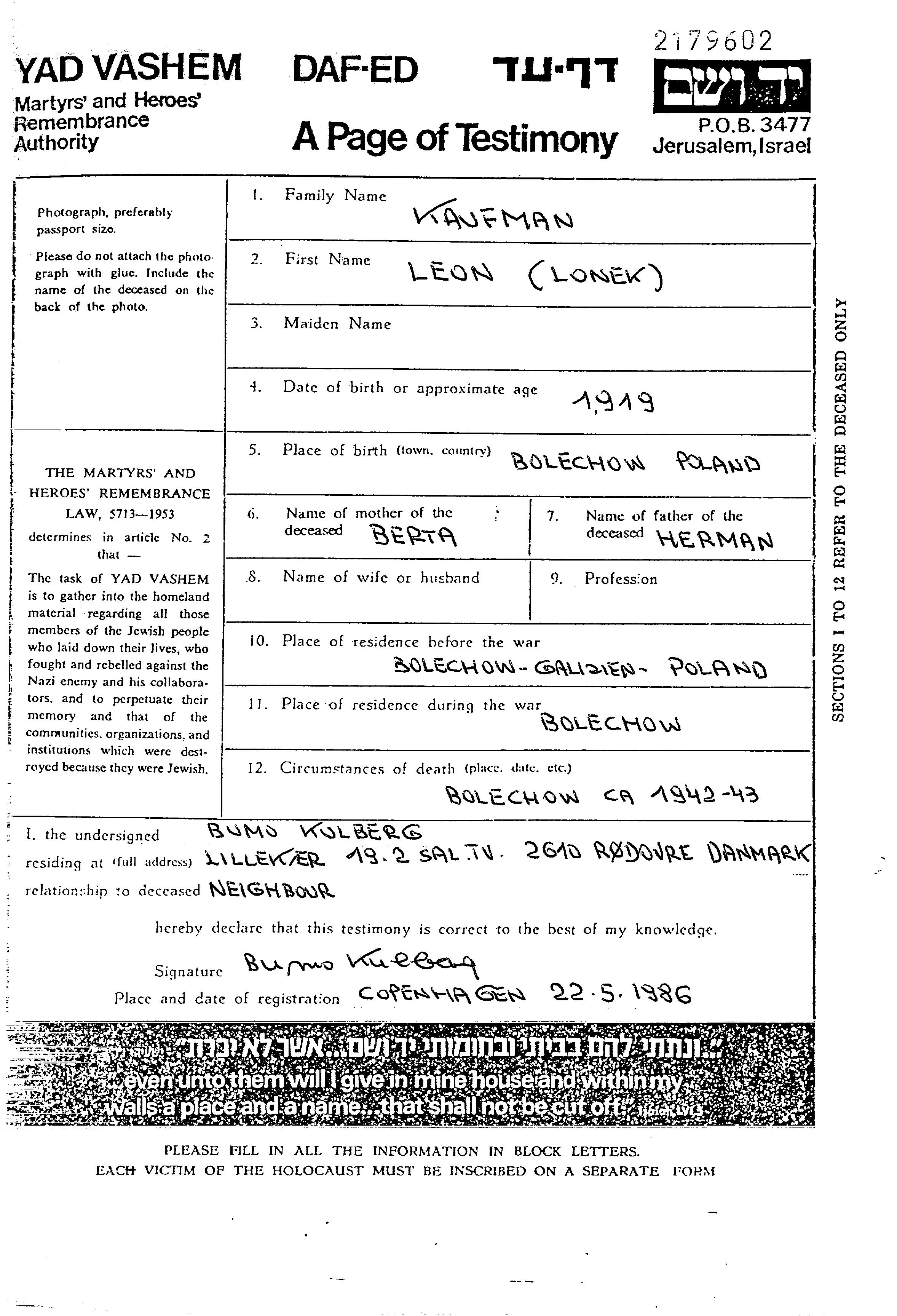 Lonek Leon Kaufman wurde im Jahr 1919 in Bolechow, Polen geboren. Er war der Sohn von Herman und Berta. Vor dem Zweiten Weltkrieg lebte er in Bolechow, Polen. Während des Krieges war er in Bolechow, Polen.