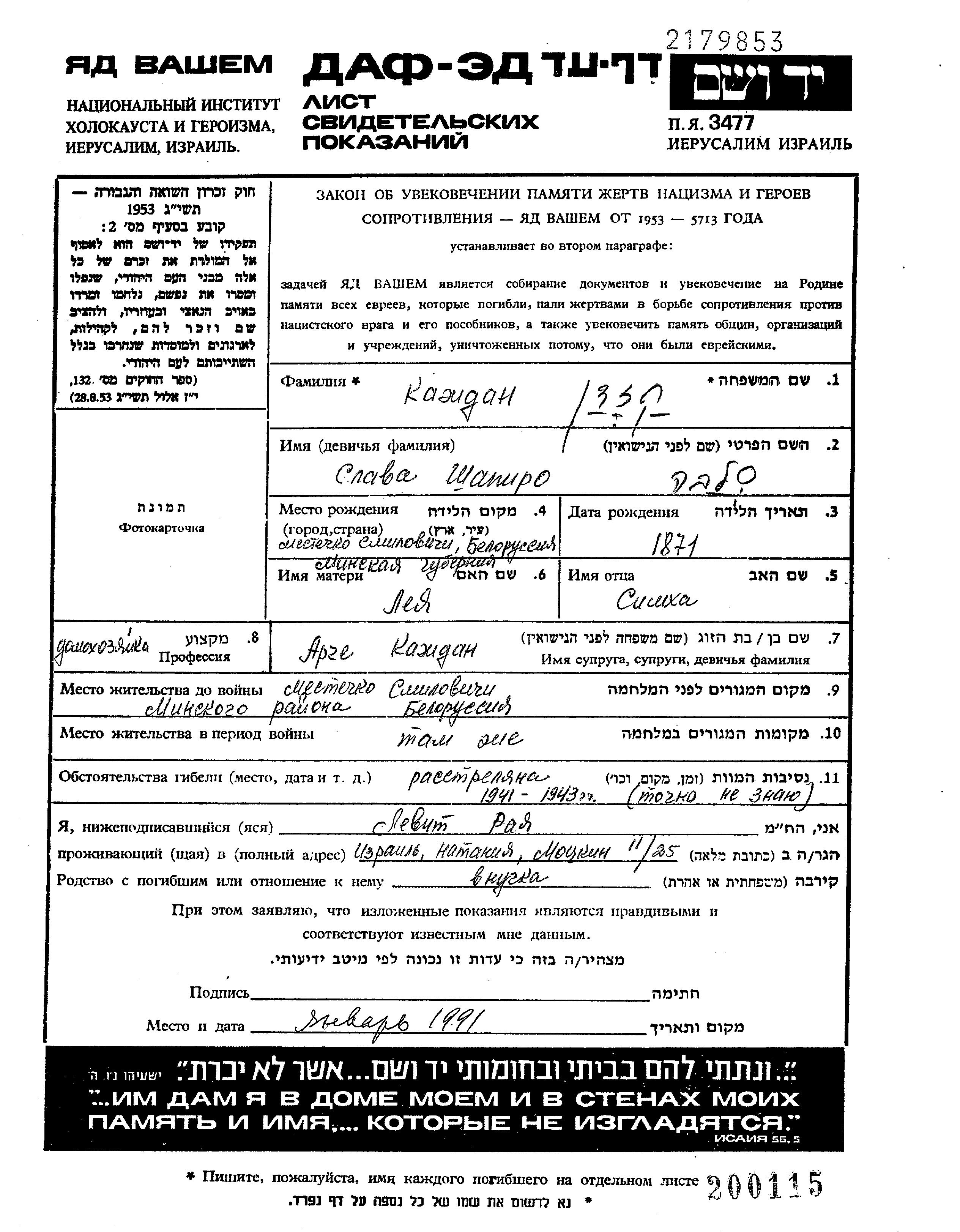 Slava Kazhdan, geb. Shapiro wurde im Jahr 1871 in Smilovichi, Weißrussland (UdSSR) geboren. Sie war die Tochter von Simkha und Leya. Sie war Hausfrau und mit Arche Verheiratet. Vor dem Zweiten Weltkrieg lebte sie in Smilovichi, Weißrussland (UdSSR). Während des Krieges war sie in Smilovichi, Weißrussland (UdSSR).
