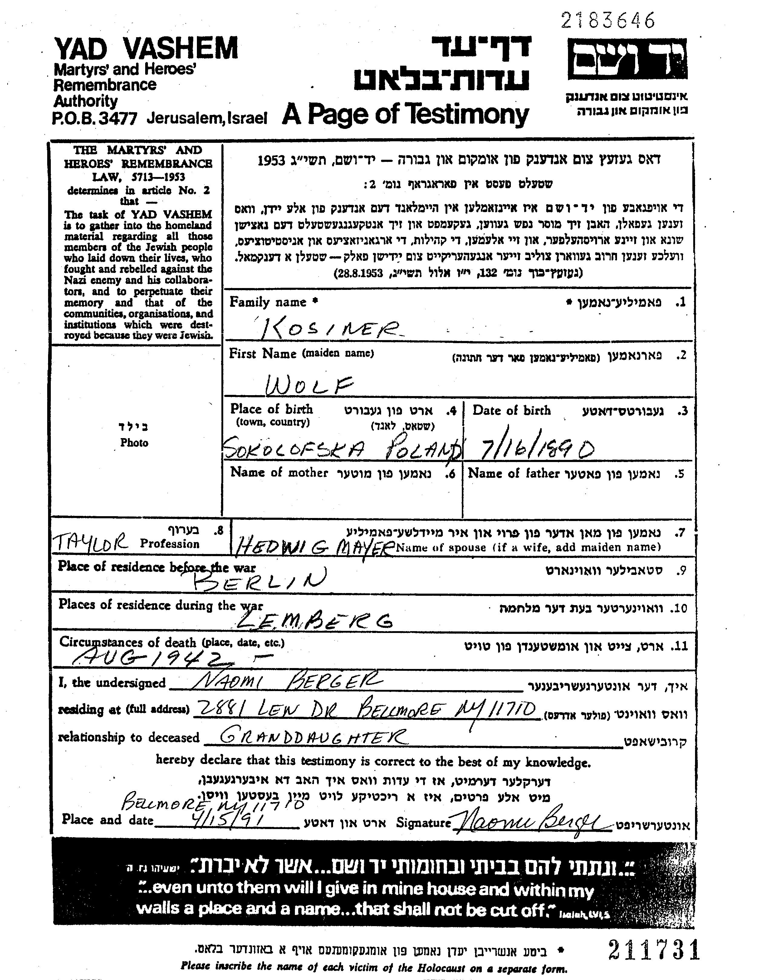 Wolf Koziner wurde im Jahr 1890 in Sokolowka, Polen geboren. Er war Schneider und mit Hedwig Verheiratet. Vor dem Zweiten Weltkrieg lebte er in Berlin, Deutsches Reich. Während des Krieges war er in Lemberg, Polen.