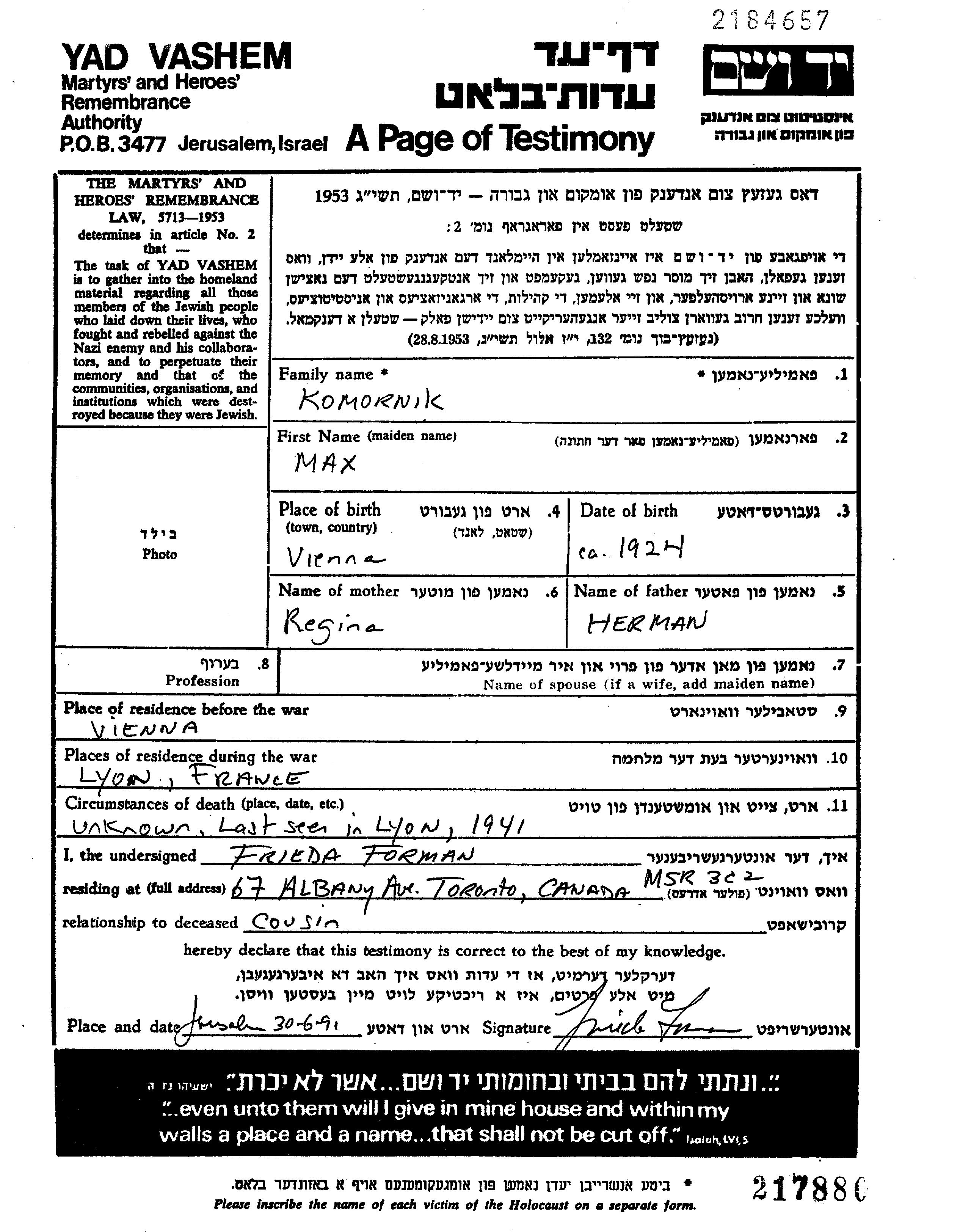 Max Komornik wurde im Jahr 1924 in Wien, Österreich geboren. Er war der Sohn von Herman und Regina. Vor dem Zweiten Weltkrieg lebte er in Wien, Österreich. Während des Krieges war er in Lyon, Frankreich.