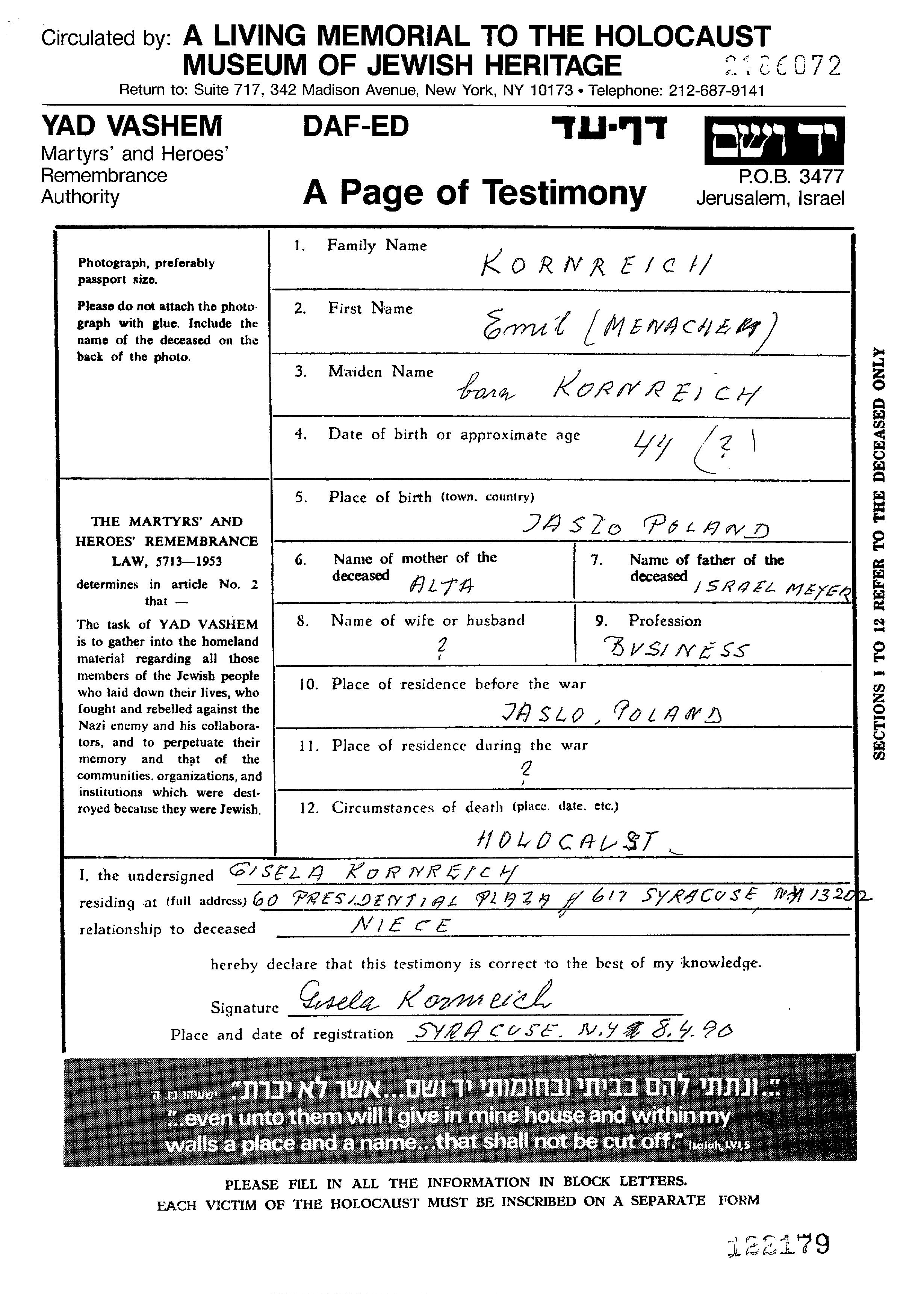 Menachem Emil Kornreich wurde in Jaslo, Polen geboren. Er war der Sohn von Israel Meyer und Alta. Er war Geschäftsmann. Vor dem Zweiten Weltkrieg lebte er in Jaslo, Polen.