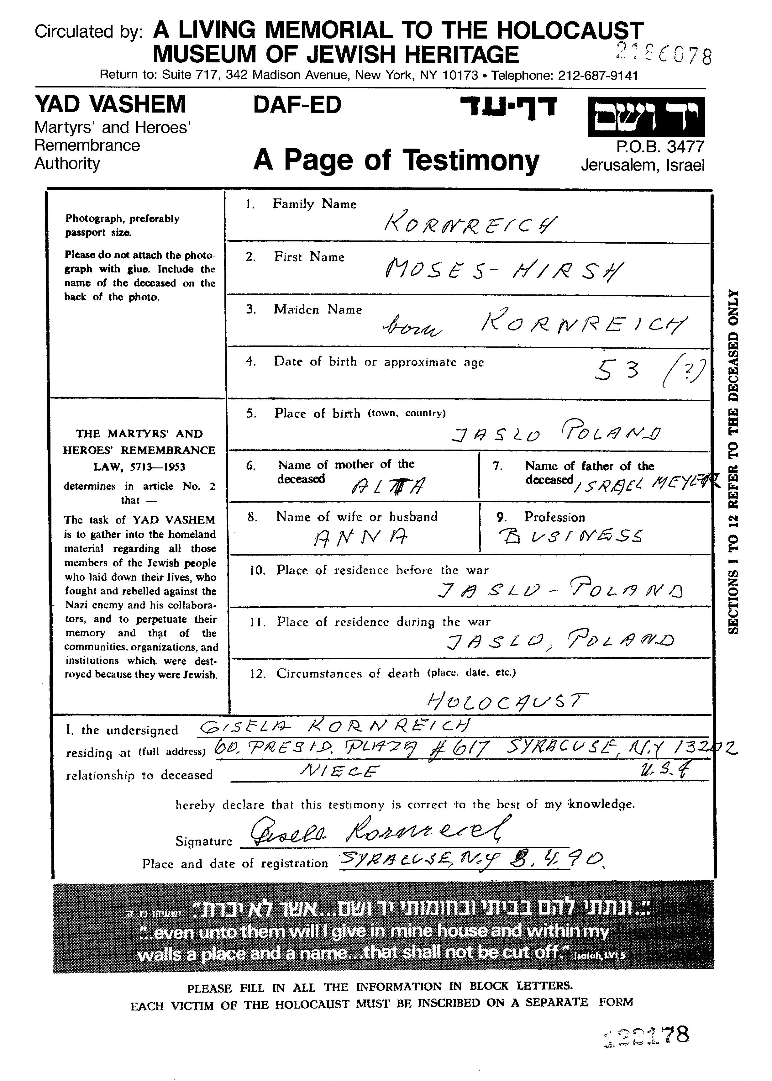 Moses Hirsh Kornreich wurde in Jaslo, Polen geboren. Er war der Sohn von Meyer und Alta. Er war Geschäftsmann und mit Anna Verheiratet. Vor dem Zweiten Weltkrieg lebte er in Jaslo, Polen. Während des Krieges war er in Jaslo, Polen.