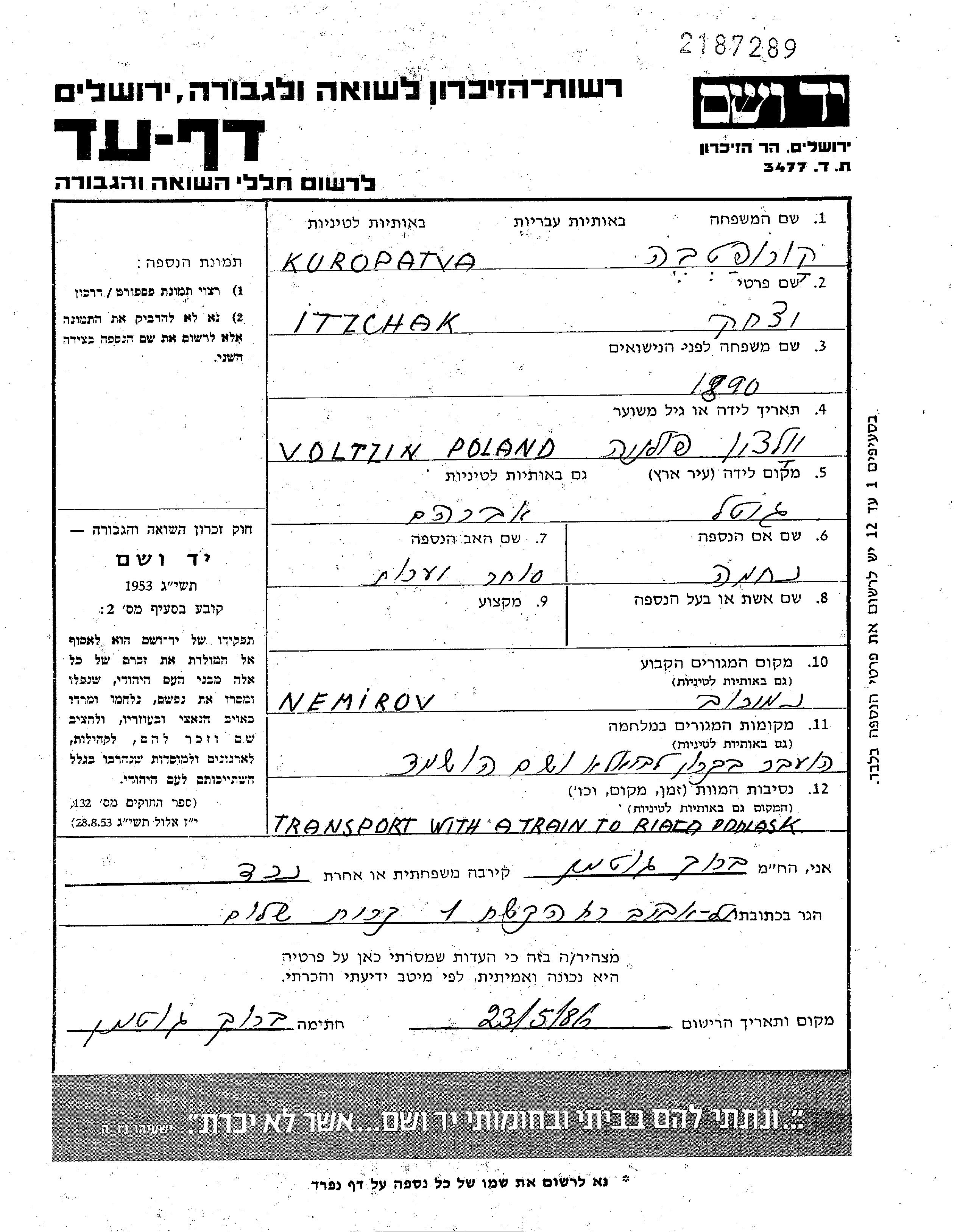 Yitzhak Kuropatva wurde im Jahr 1890 in Wolczyn, Polen geboren. Er war der Sohn von Abraham und Gitel. Er war Kaufmann/-frau und mit Nekhama Verheiratet. Vor dem Zweiten Weltkrieg lebte er in Niemirow, Polen. Während des Krieges war er in Niemirow, Polen.