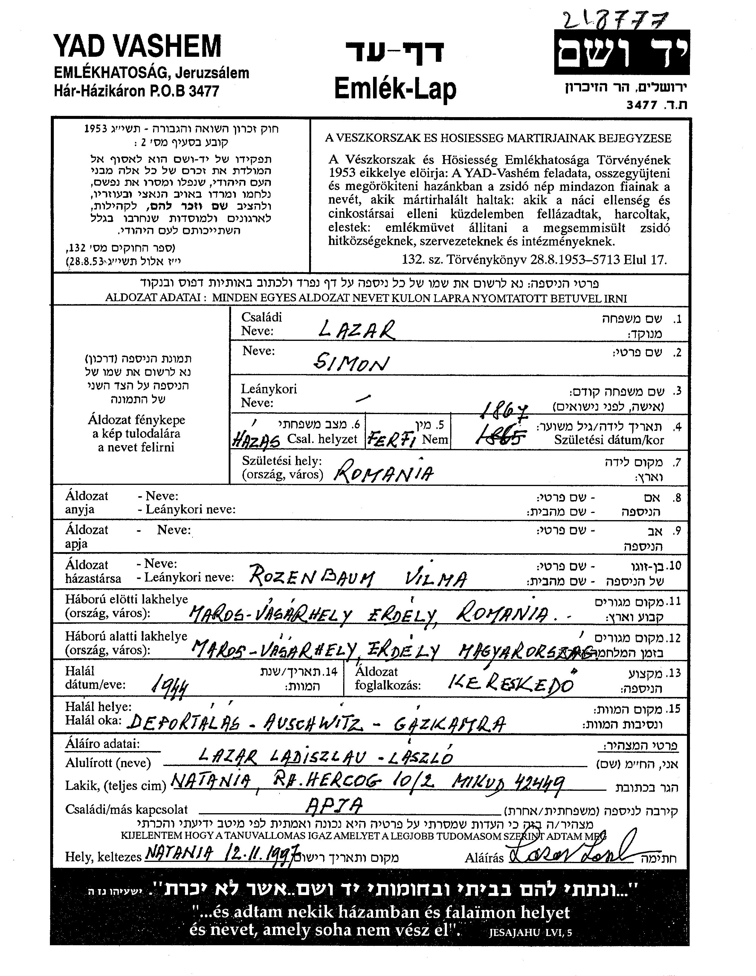 Simon Lazar wurde im Jahr 1867 in Rumänien geboren. Er war Kaufmann/-frau und mit Vilma Verheiratet. Vor dem Zweiten Weltkrieg lebte er in Marosvasarhely, Rumänien. Während des Krieges war er in Marosvasarhely, Rumänien.