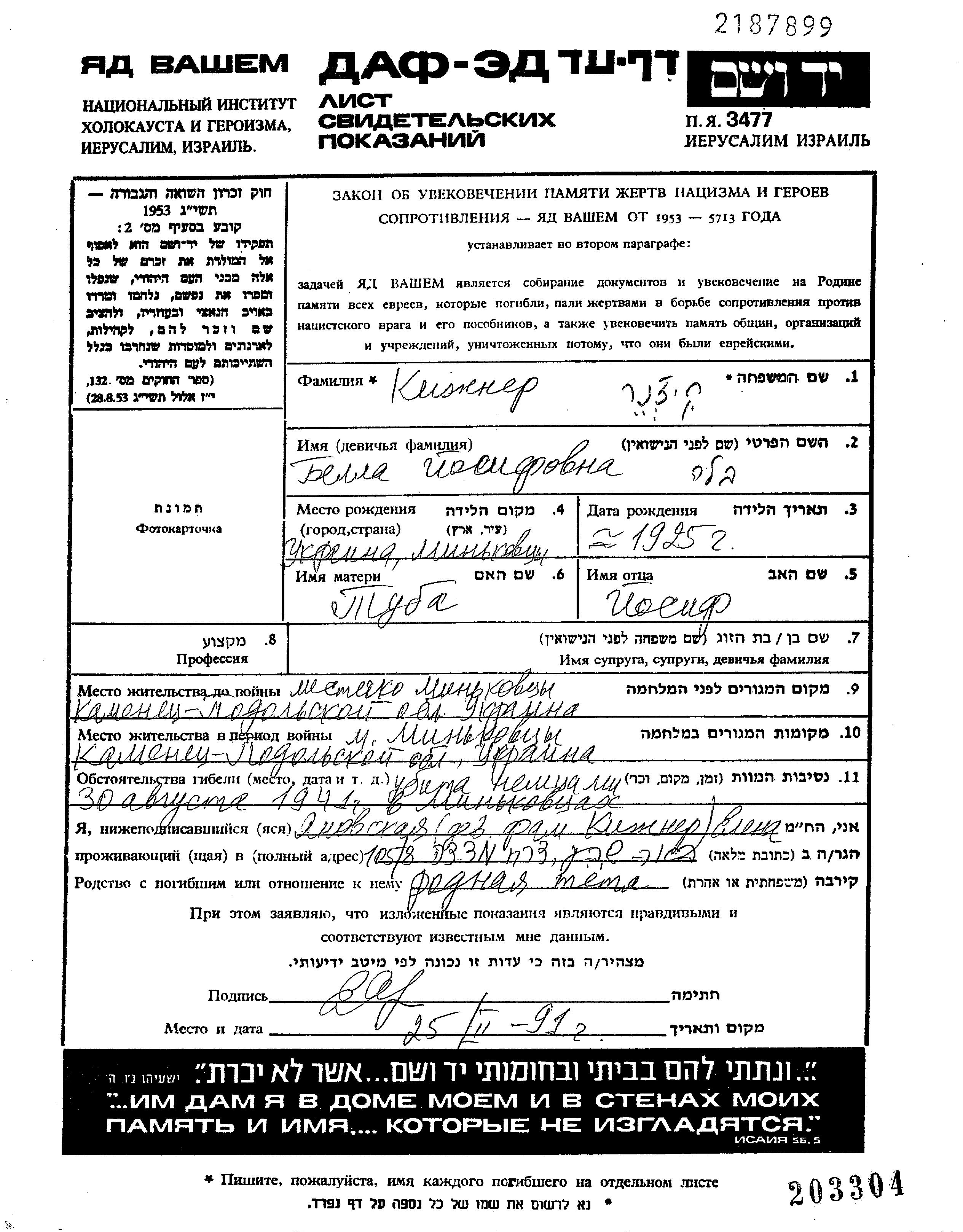 Bela Kizhner wurde im Jahr 1925 in Minkovtsy, Ukraine (UdSSR) geboren. Sie war die Tochter von Yosif und Tuba Tova. Vor dem Zweiten Weltkrieg lebte sie in Minkovtsy, Ukraine (UdSSR). Während des Krieges war sie in Minkovtsy, Ukraine (UdSSR).