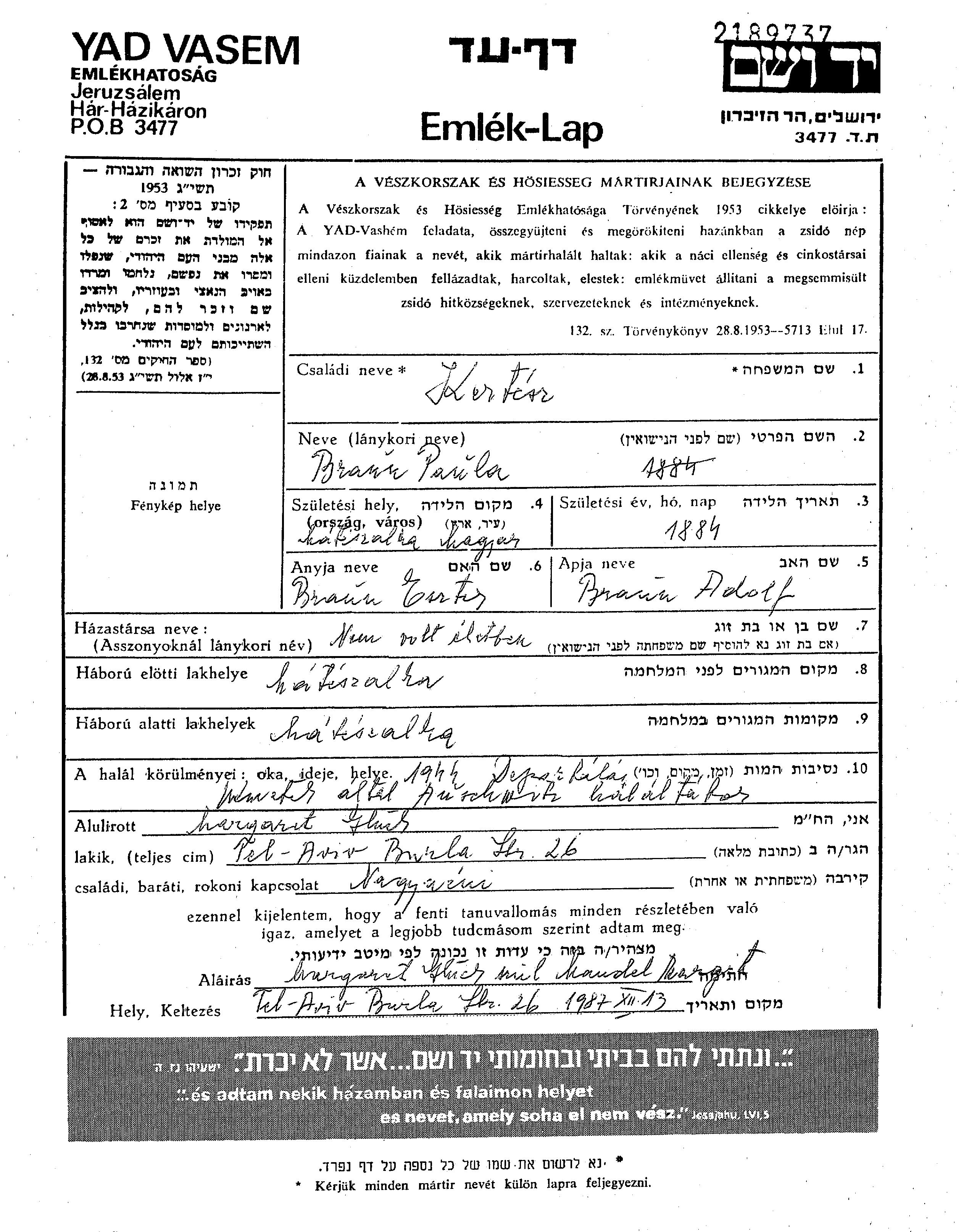 Paula Kertesz, geb. Braun wurde im Jahr 1884 in Mateszalka, Ungarn geboren. Sie war die Tochter von Adolf und Eszter. Vor dem Zweiten Weltkrieg lebte sie in Mateszalka, Ungarn. Während des Krieges war sie in Mateszalka, Ungarn.
