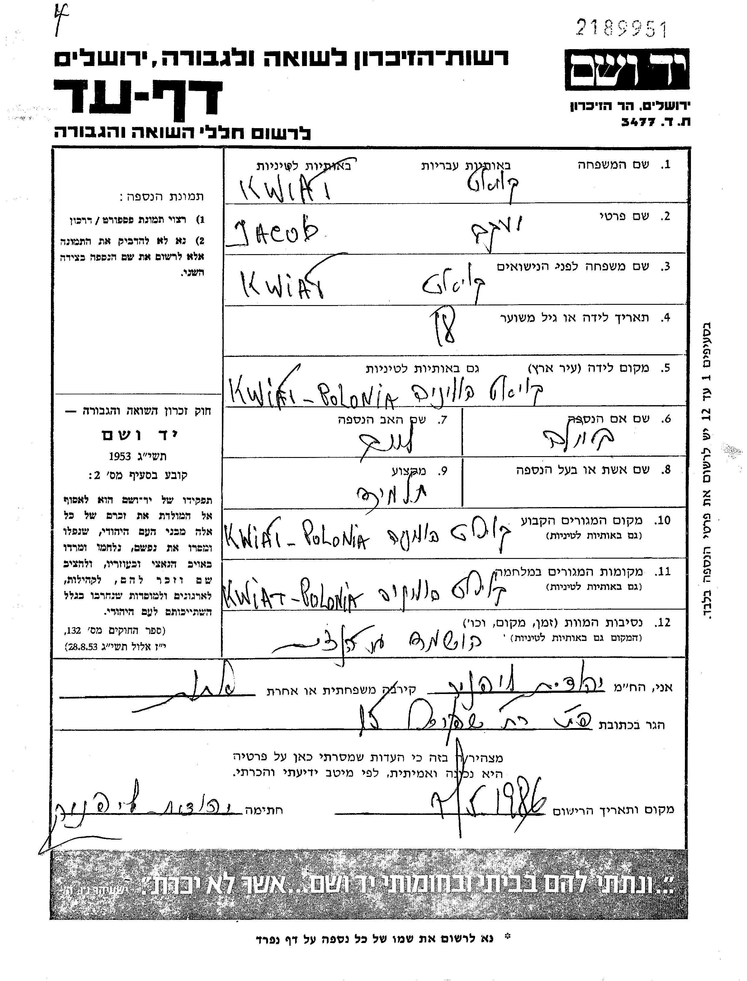 Jacob Kwiat wurde in Kwatery, Polen geboren. Er war der Sohn von Leib und Beila, geb. Glembocki. Er war Schüler/-in und Ledig. Vor dem Zweiten Weltkrieg lebte er in Kwatery, Polen. Während des Krieges war er in Kwatery, Polen.
