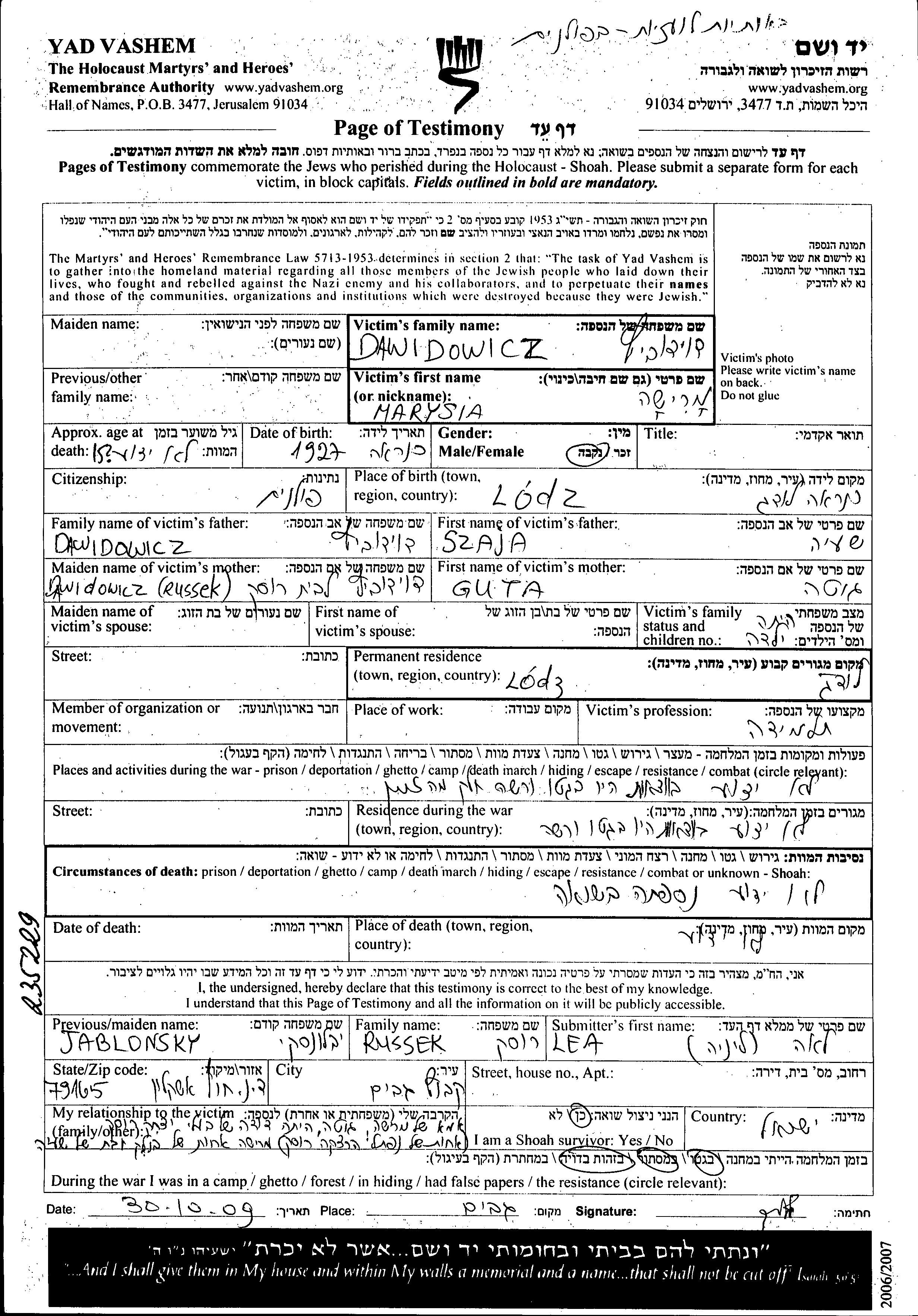Dawidowicz Marysia 1927 Lodz, Polen Gedenkblatt