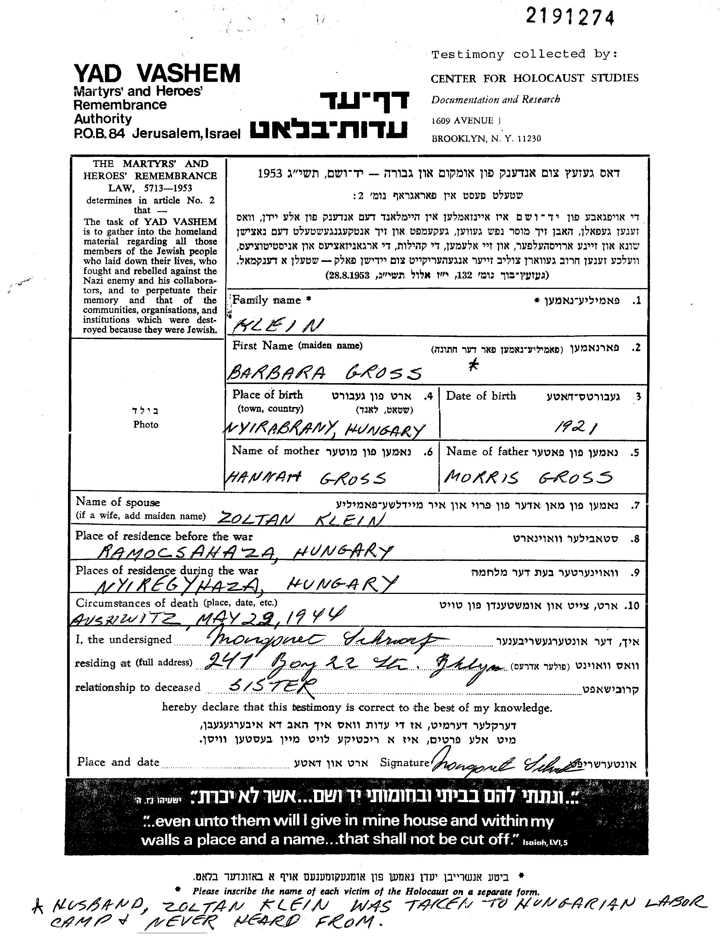 Barbara Klein, geb. Gross wurde im Jahr 1921 in Nyirabrany, Ungarn geboren. Sie war die Tochter von Morris und Hannah. Sie war mit Zoltan Verheiratet. Vor dem Zweiten Weltkrieg lebte sie in Ramocsahaza, Ungarn. Während des Krieges war sie in Nyiregyhaza, Ungarn.