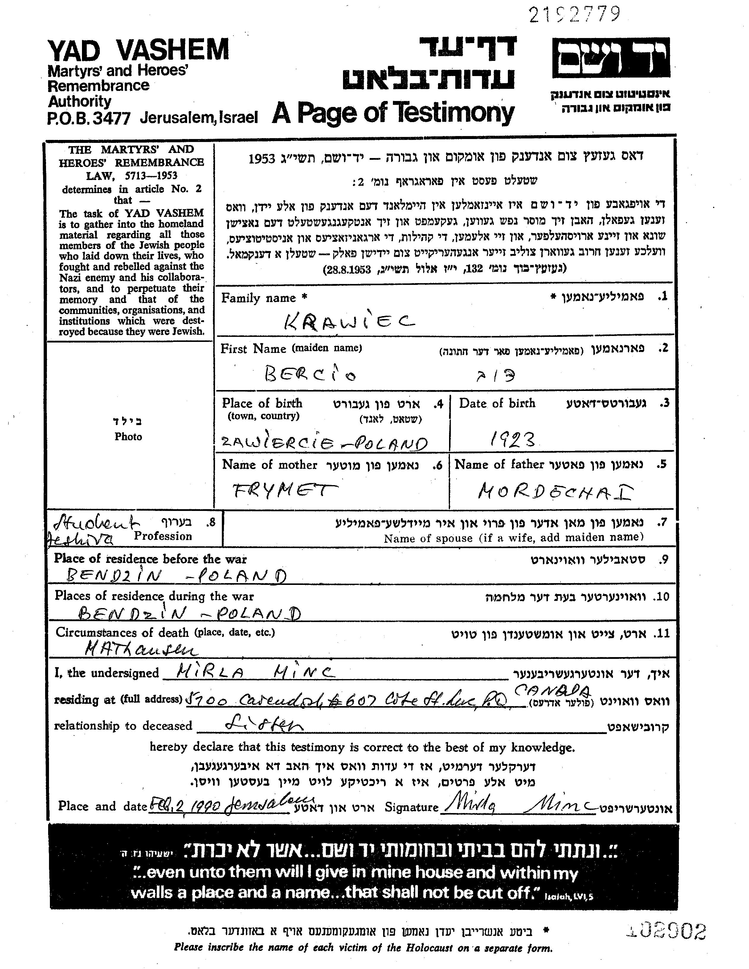 Bercio Dov Krawiec wurde im Jahr 1923 in Zawiercie, Polen geboren. Er war der Sohn von Mordechai und Frymet, geb. Milstein. Er war Jeschiwahschüler. Vor dem Zweiten Weltkrieg lebte er in Będzin, Polen. Während des Krieges war er in Będzin, Polen.
