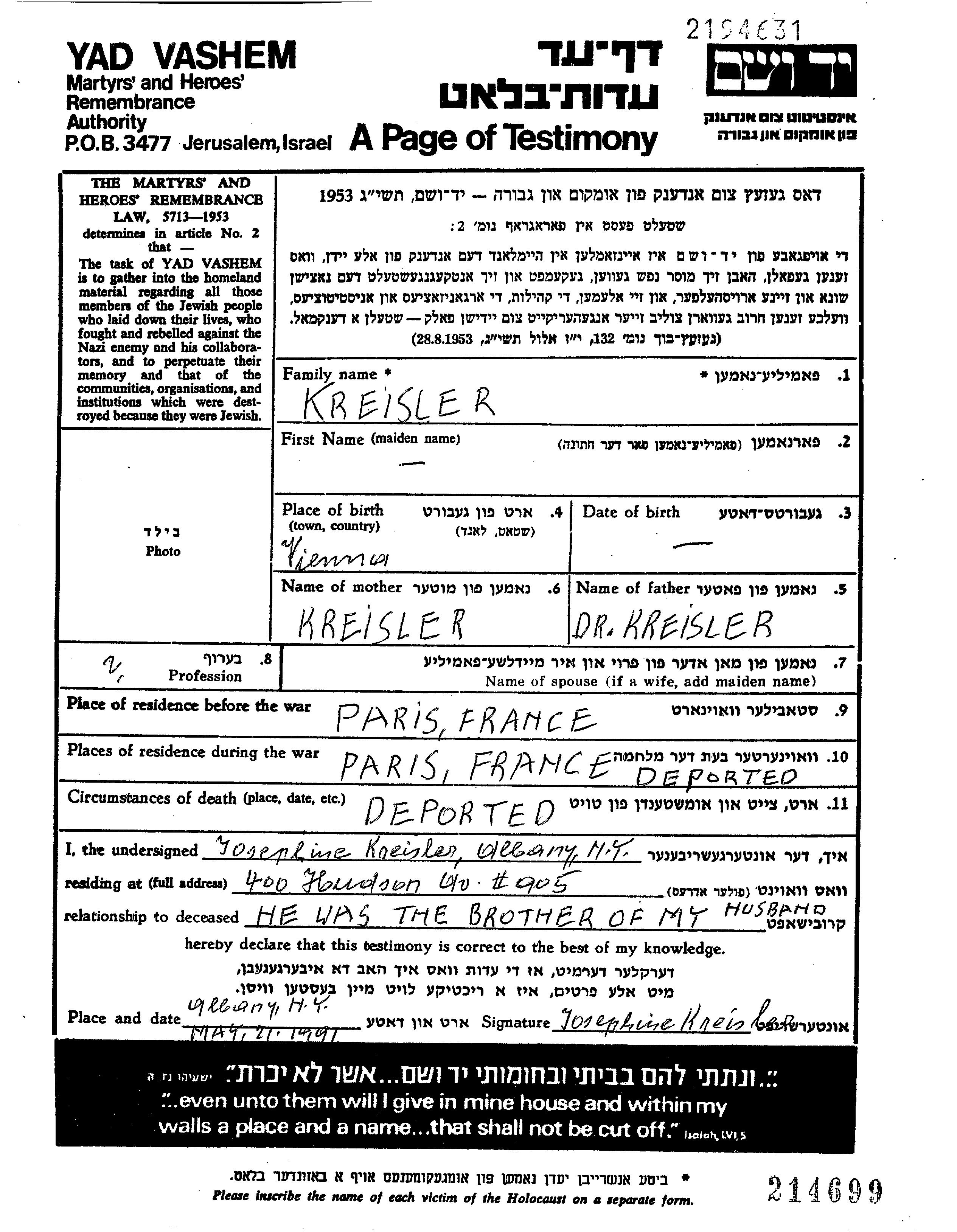 Vorname unbekannt Kreisler wurde in Wien, Österreich geboren. Vor dem Zweiten Weltkrieg lebte er in Paris, Frankreich. Während des Krieges war er in Paris, Frankreich.