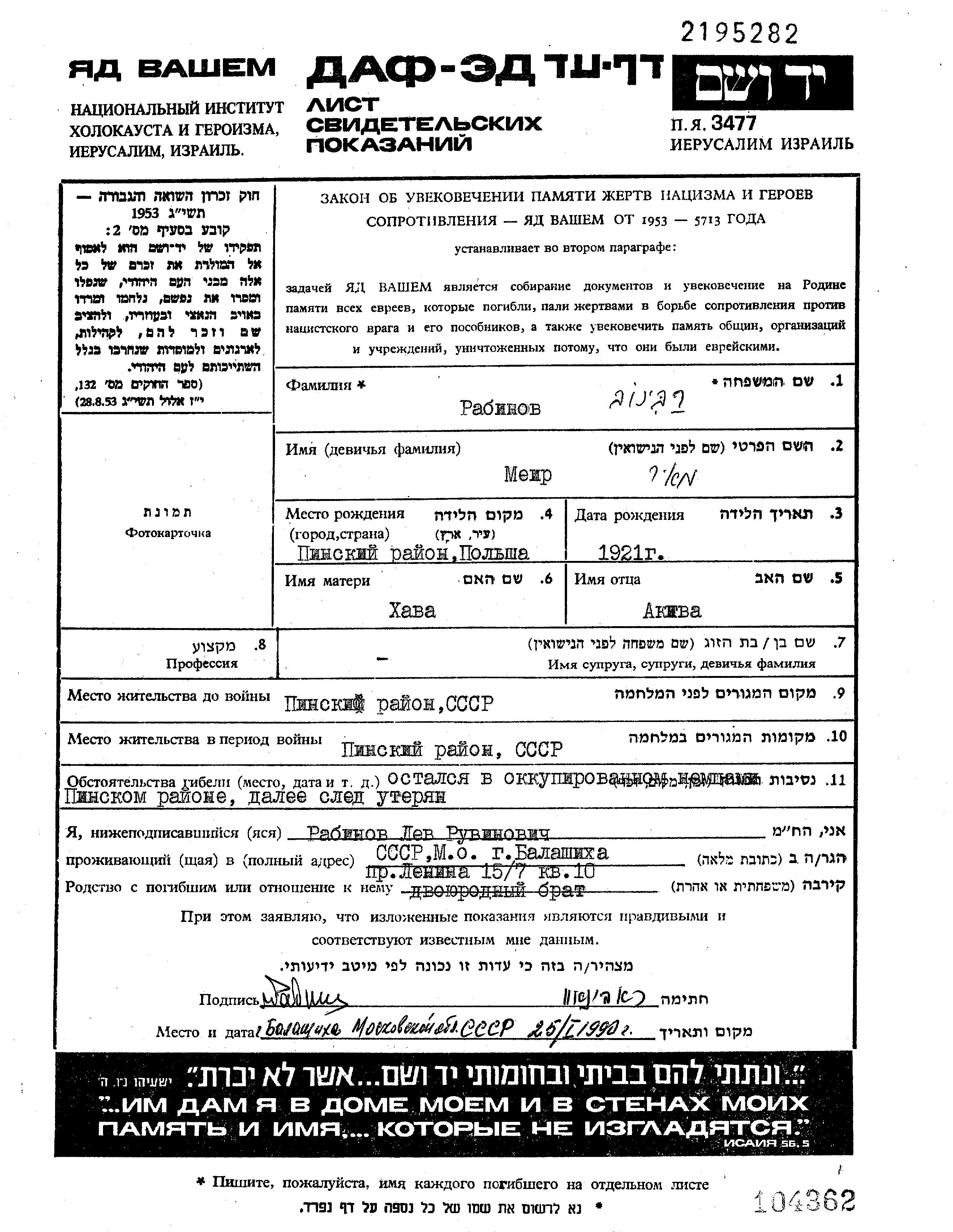 Rabinov Meir 1921 Pinsk, Polen Gedenkblatt