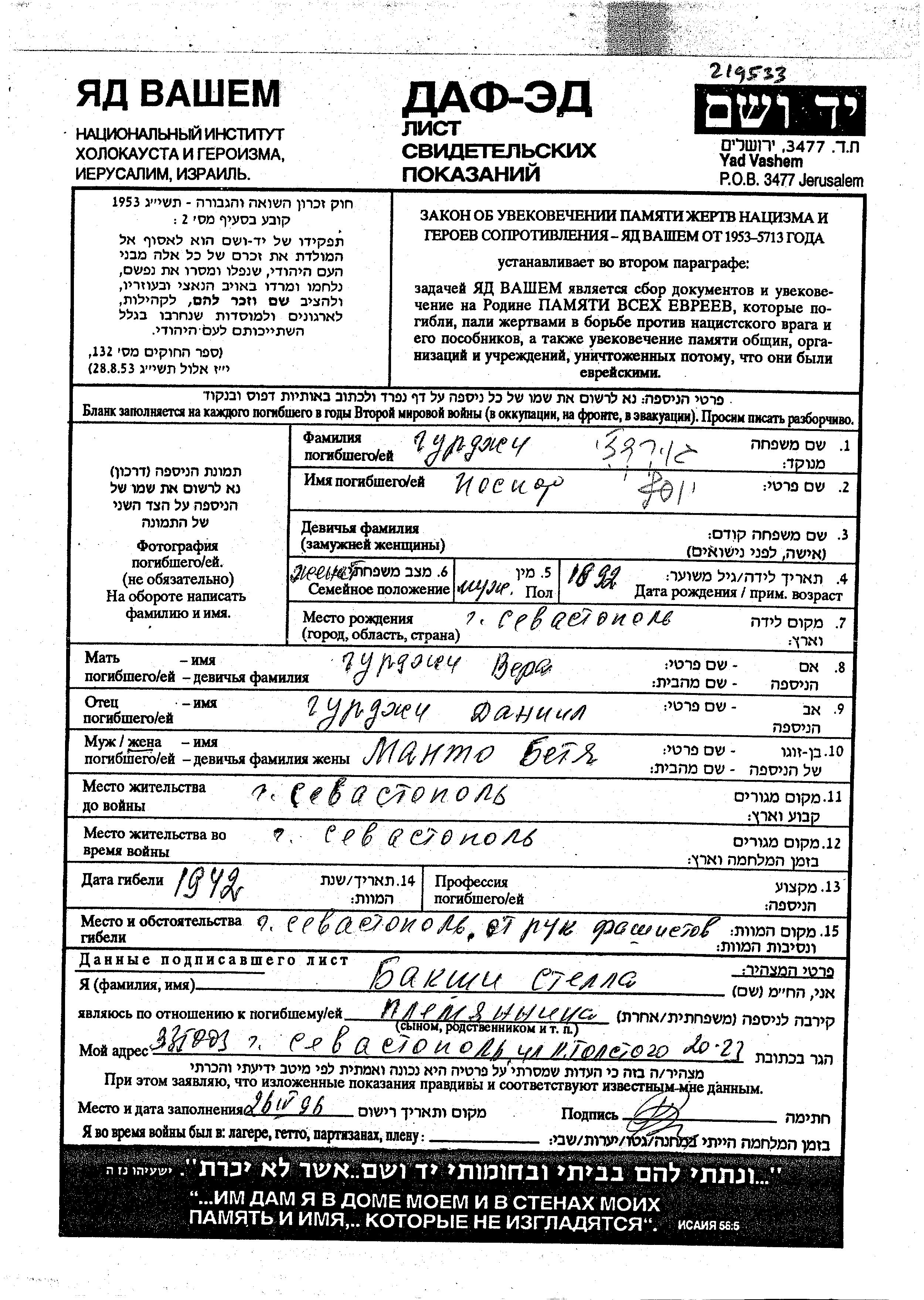 Iosif wurde in der Schoah ermordet. Todesort: Sevastopol, Russland (UdSSR) im Jahr 1942.