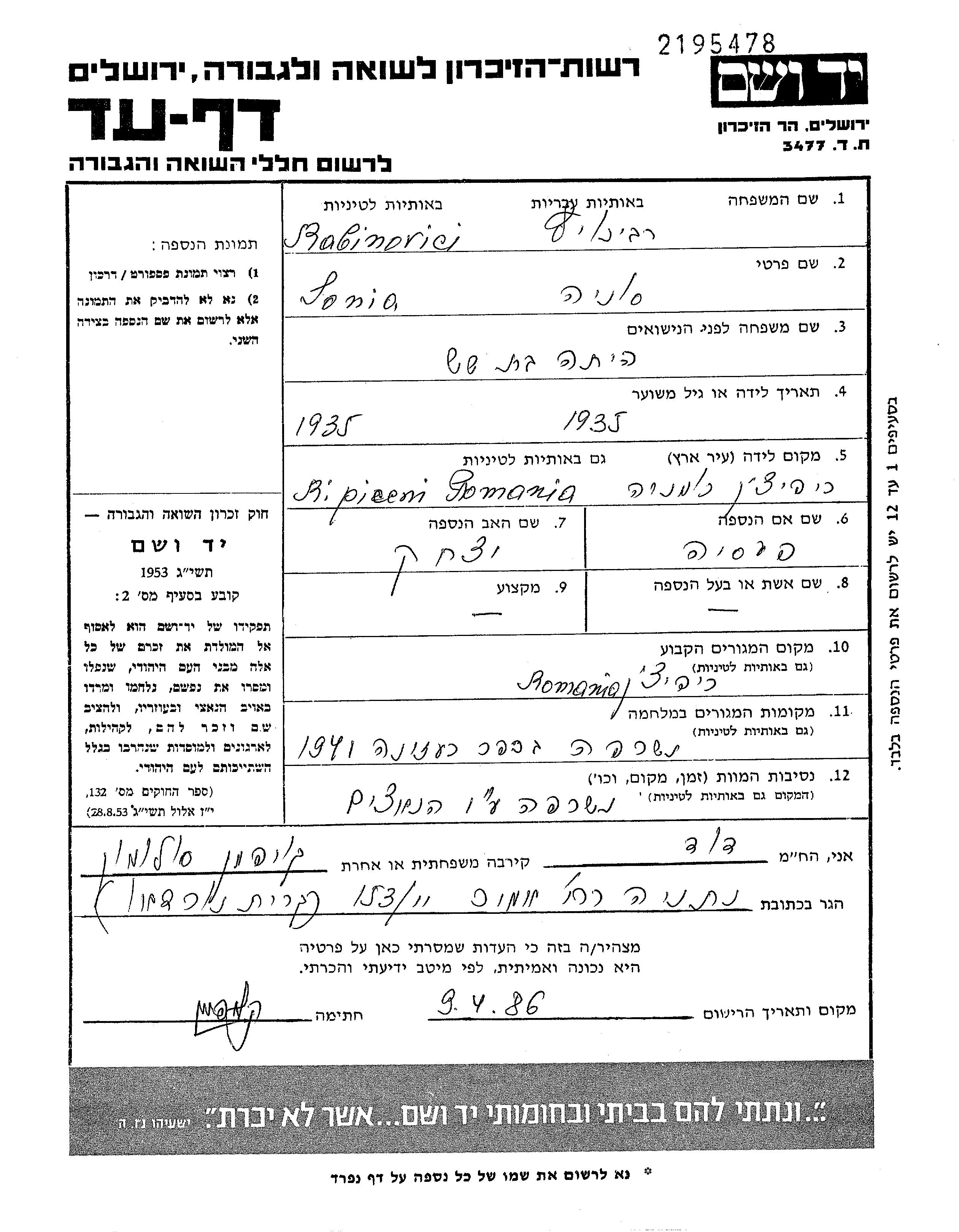 Rabinovici Sonia 1935 Ripiceni, Rumänien Gedenkblatt
