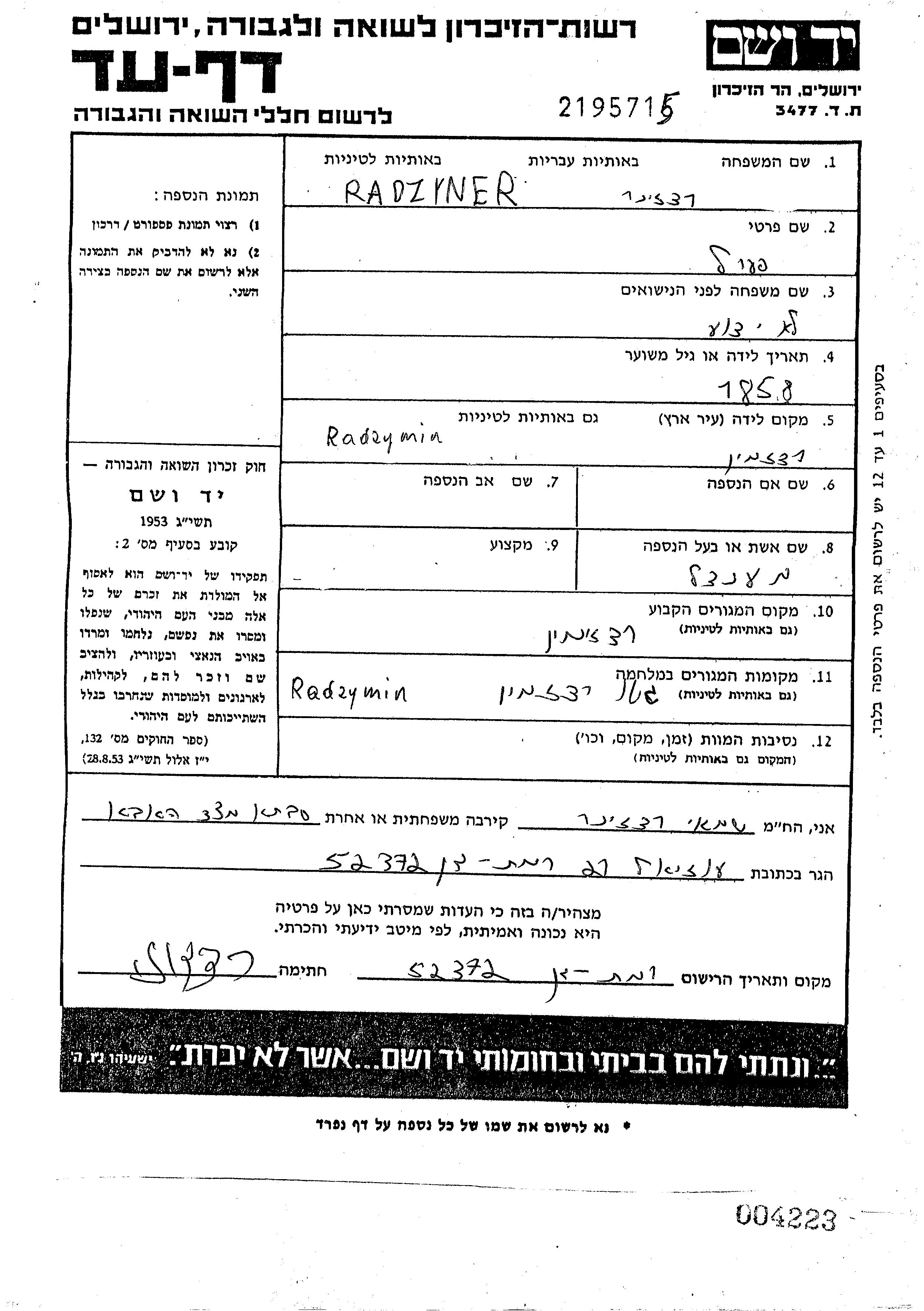 Perl Radzyner wurde im Jahr 1858 in Radzymin, Polen geboren. Sie war mit Mendel Verheiratet. Vor dem Zweiten Weltkrieg lebte sie in Radzymin, Polen. Während des Krieges war sie in Radzymin, Polen.