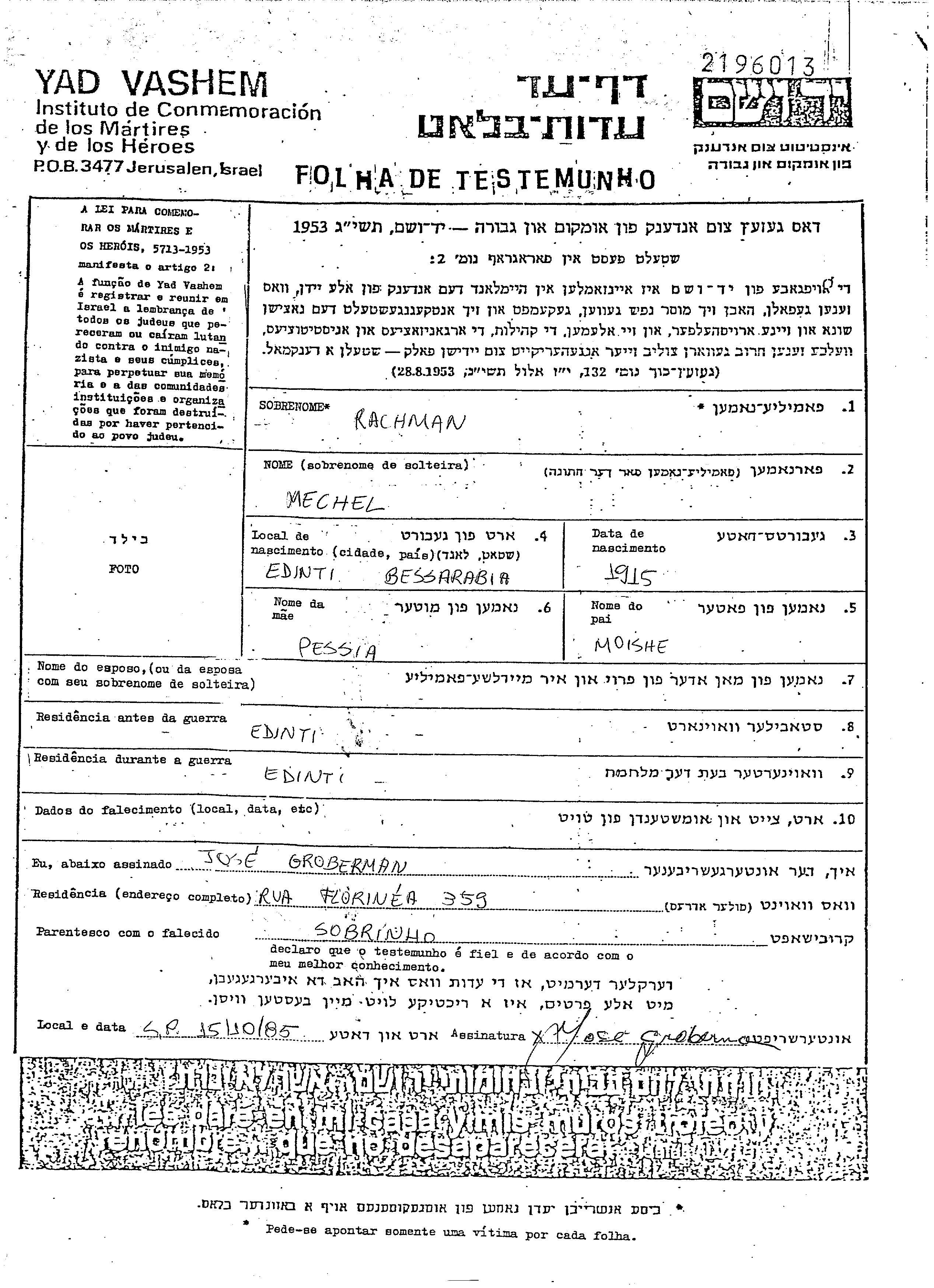 Mechel Rachman Rekhman wurde im Jahr 1915 in Edineti, Rumänien geboren. Er war der Sohn von Moishe und Pessia, geb. Groberman. Vor dem Zweiten Weltkrieg lebte er in Edineti, Rumänien. Während des Krieges war er in Edineti, Rumänien.
