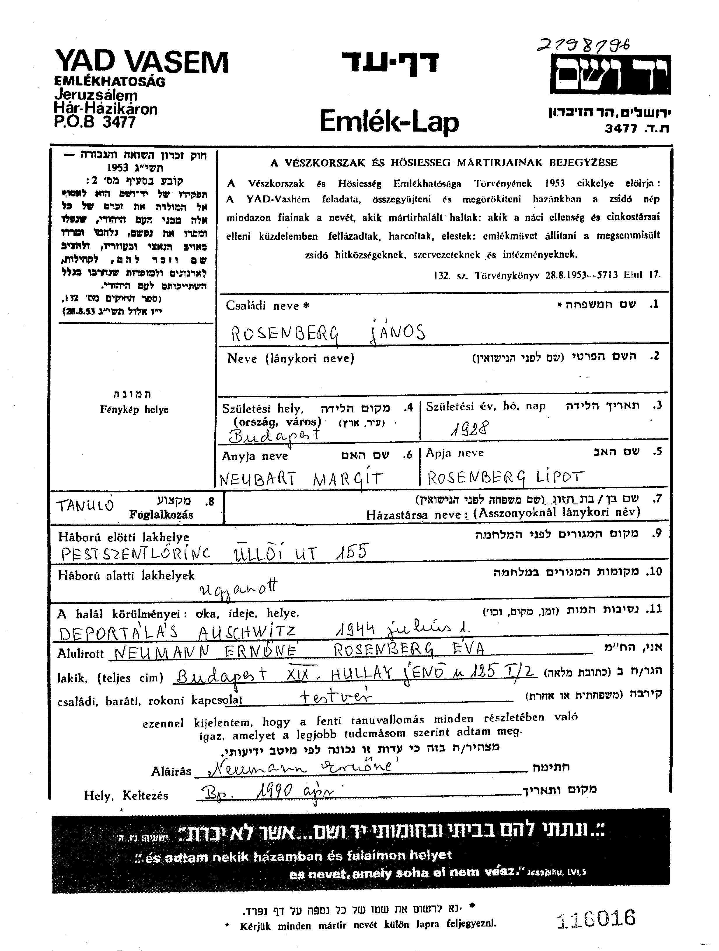 Janos Rosenberg wurde im Jahr 1928 in Budapest, Ungarn geboren. Er war der Sohn von Lipot und Margit, geb. Neubart. Er war Schüler/-in und Kind. Vor dem Zweiten Weltkrieg lebte er in Pestszentlorinc, Ungarn. Während des Krieges war er in Pestszentlorinc, Ungarn.