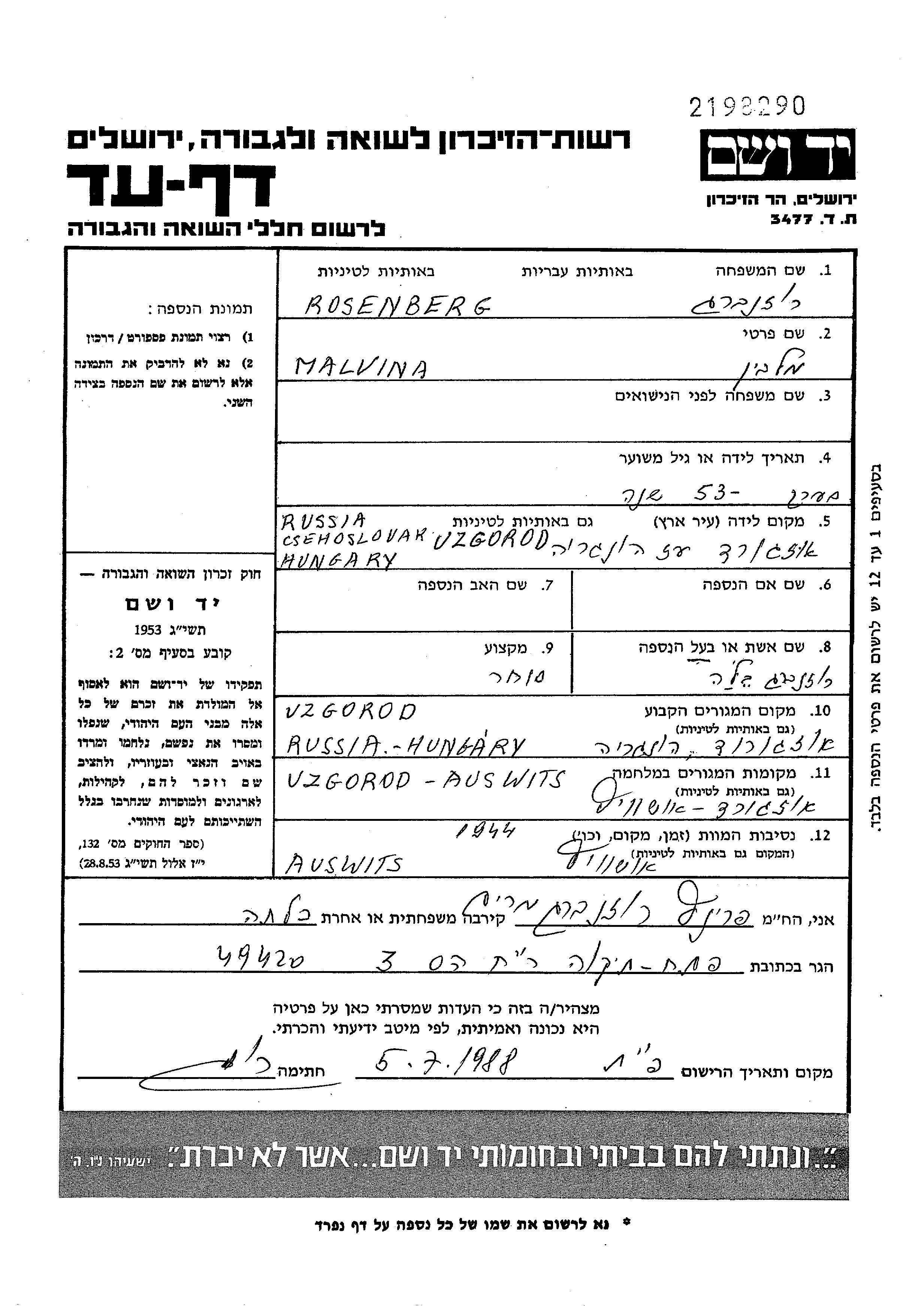 Malvina Rosenberg wurde im Jahr 1891 in Uzhorod, Tschechoslowakei geboren. Sie war mit Bela Verheiratet. Vor dem Zweiten Weltkrieg lebte sie in Uzhorod, Tschechoslowakei. Während des Krieges war sie in Uzhorod, Tschechoslowakei.