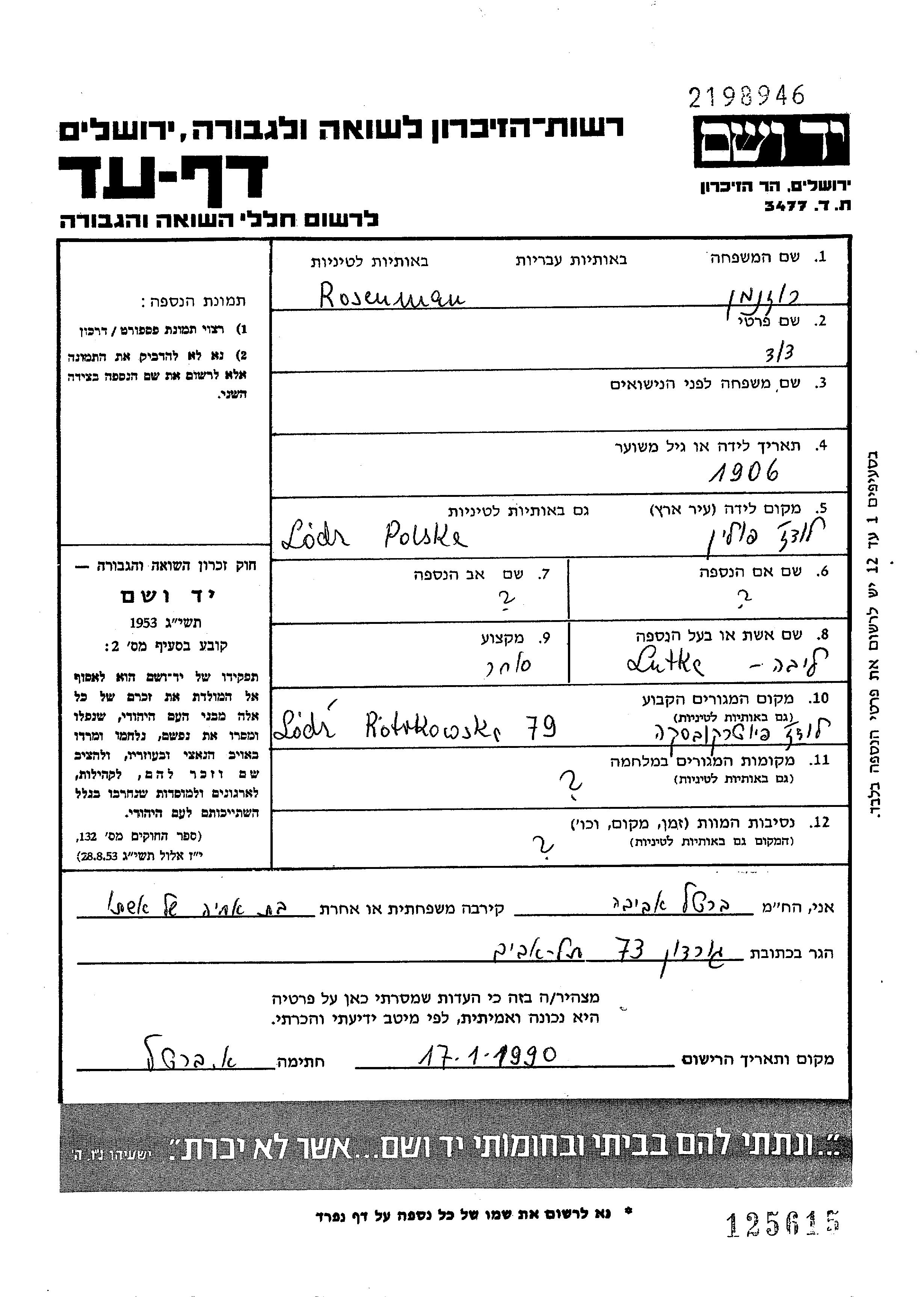 Rosenman David 1906 Lodz, Polen Gedenkblatt