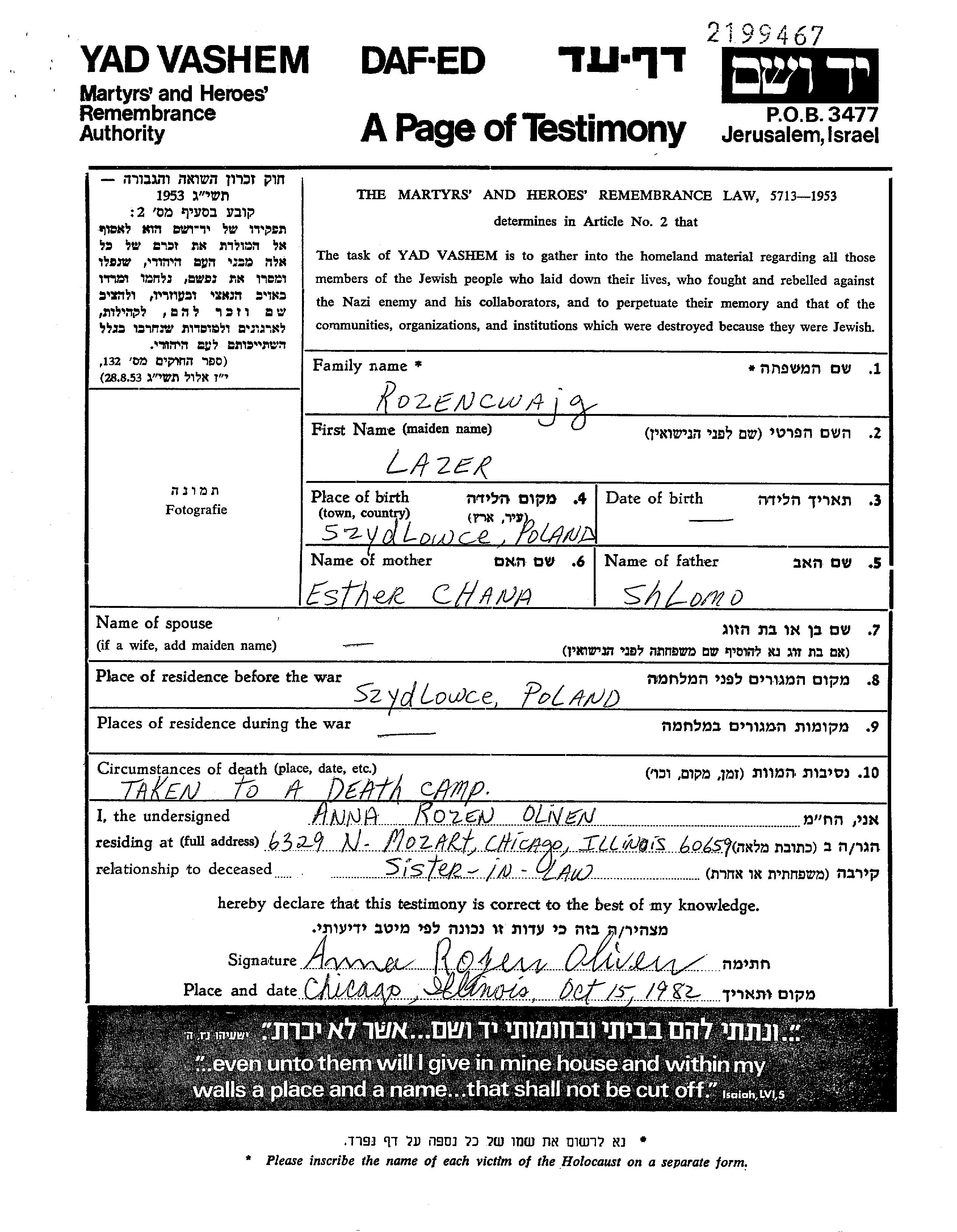 Lazer Rozencwajg wurde in Szydlowiec, Polen geboren. Er war der Sohn von Shlomo und Esther Chana. Vor dem Zweiten Weltkrieg lebte er in Szydlowiec, Polen.