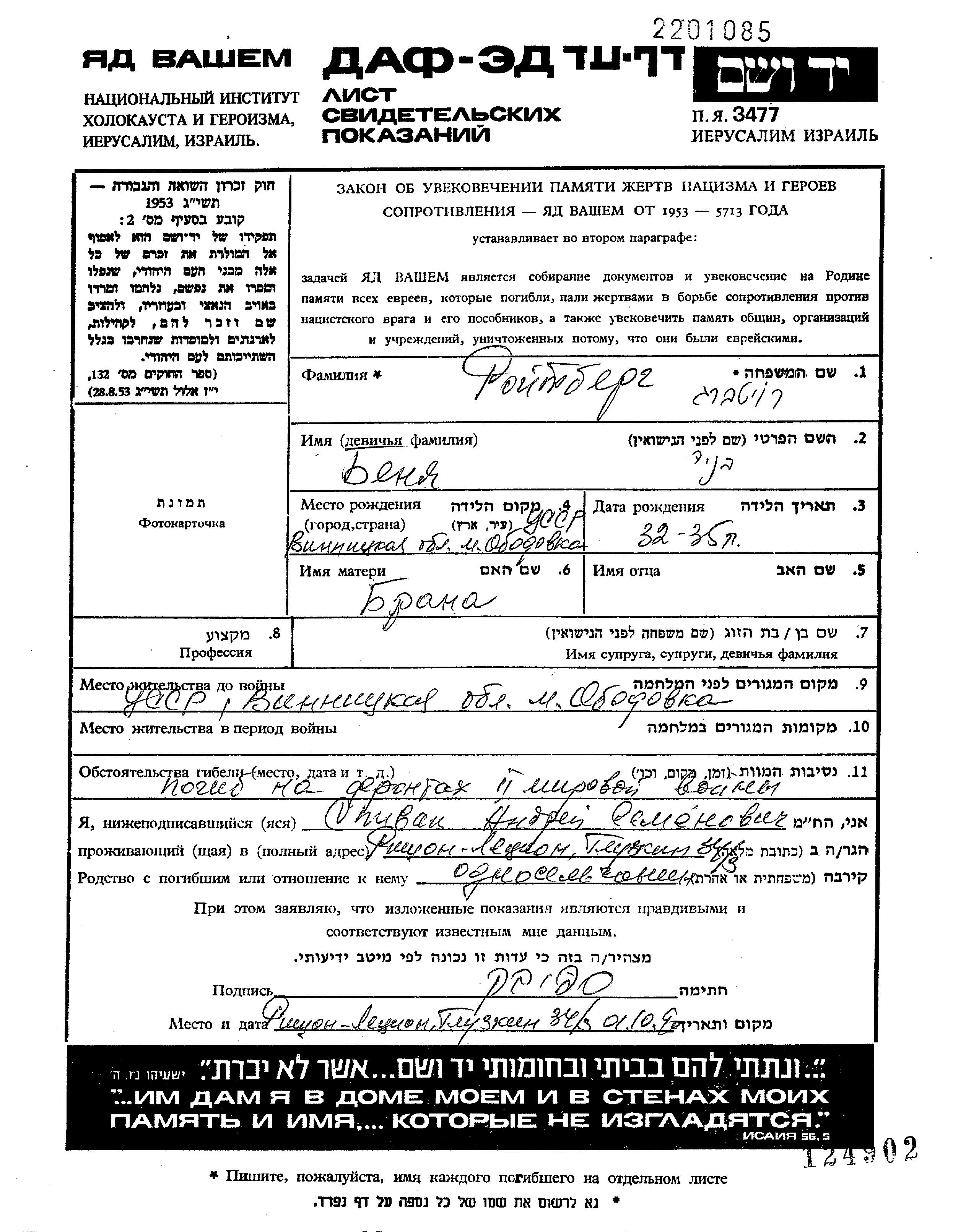 Benya Roitberg wurde in Obodovka, Ukraine (UdSSR) geboren. Er war der Sohn von Brana. Er war Verheiratet. Vor dem Zweiten Weltkrieg lebte er in Obodovka, Ukraine (UdSSR). Während des Krieges war er in die Sowjetischen Streitkräfte. Benya im Militärdienst umgekommen.