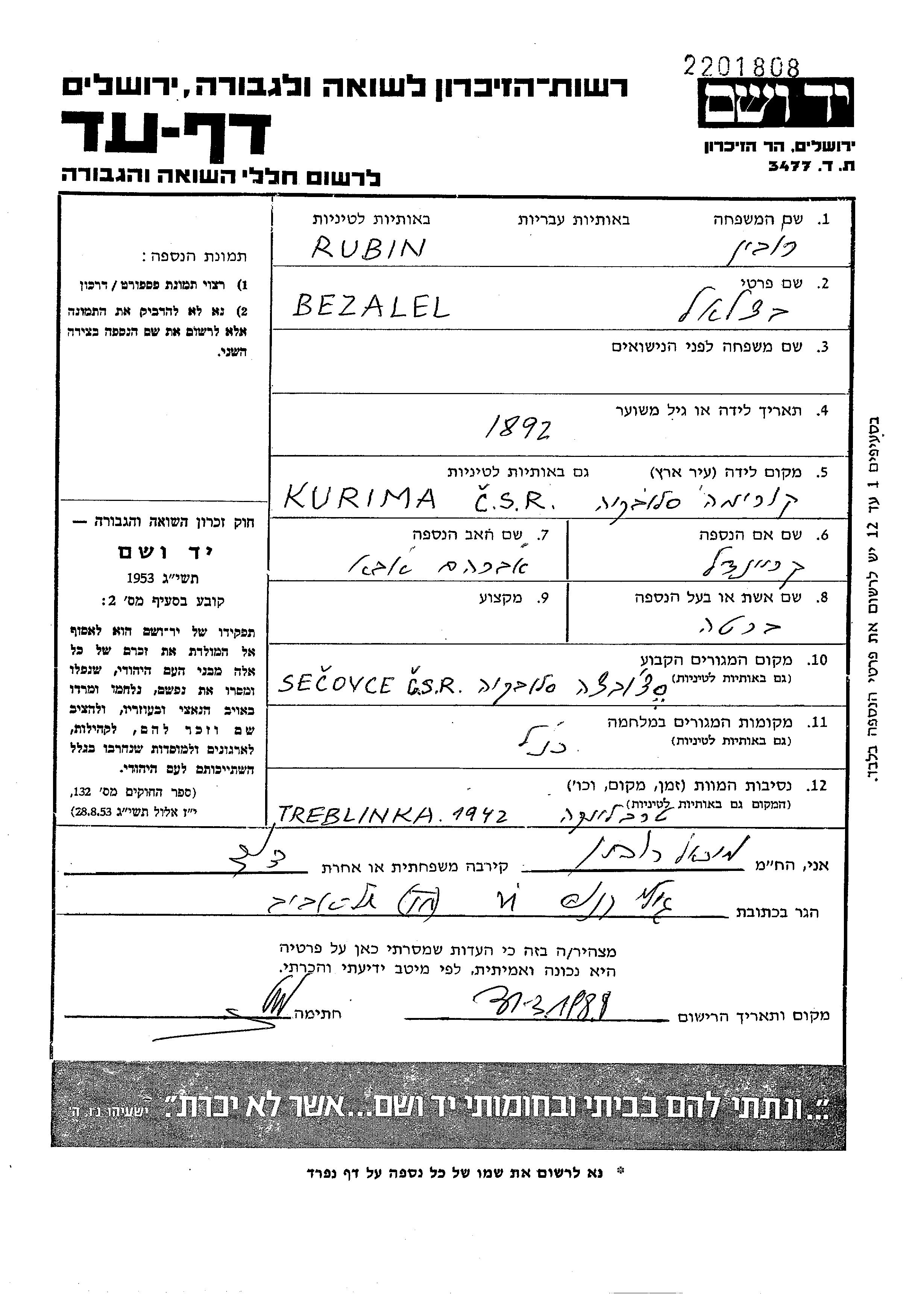 Bezalel Rubin wurde im Jahr 1892 in Kurima, Tschechoslowakei geboren. Er war der Sohn von Avraham Aba und Kreindel. Er war mit Berta Verheiratet. Vor dem Zweiten Weltkrieg lebte er in Secovce, Tschechoslowakei. Während des Krieges war er in Secovce, Tschechoslowakei.