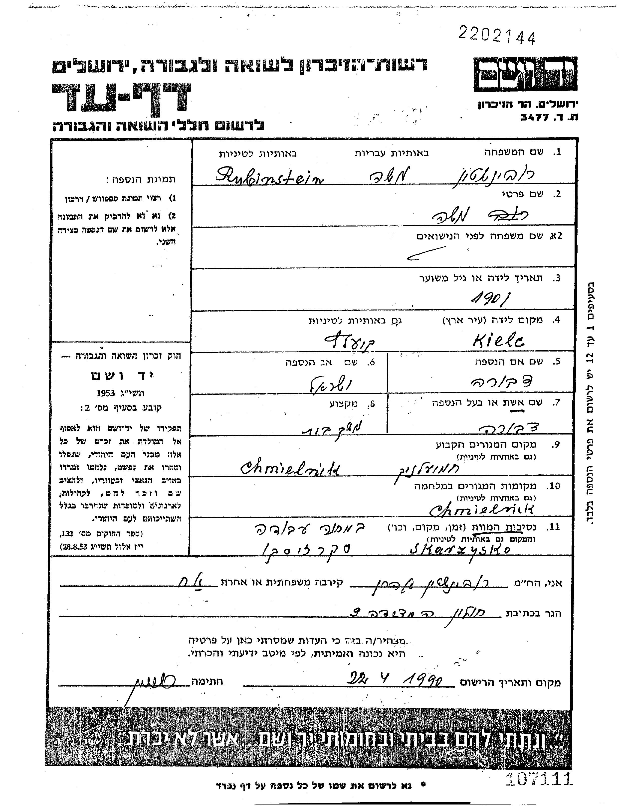 Rubinstein Moshe 1901 Chmielnik, Polen Gedenkblatt