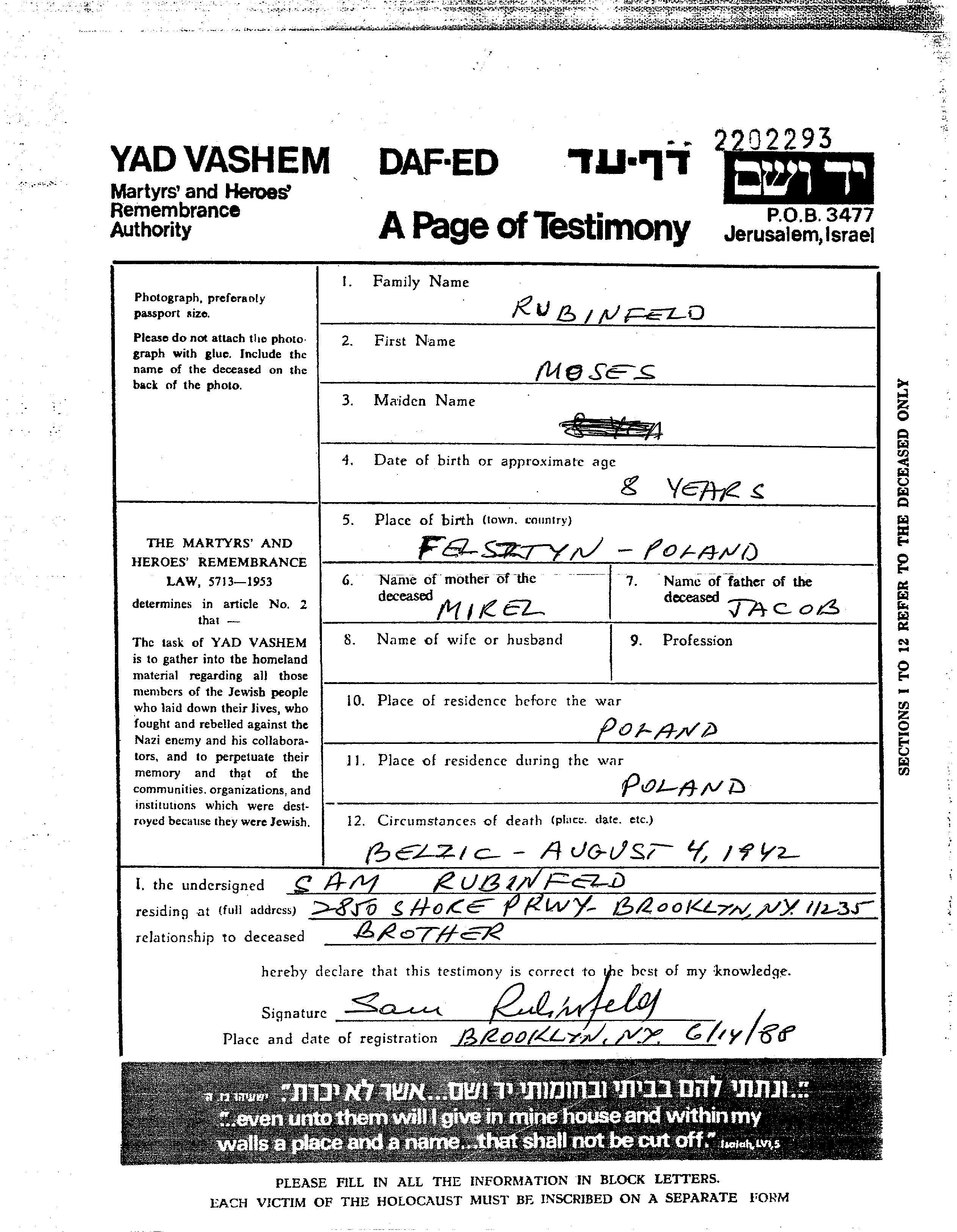 Moses Rubinfeld wurde im Jahr 1934 in Felsztyn, Polen geboren. Er war der Sohn von Jacob und Mirl, geb. Friendel. Er war Kind. Vor dem Zweiten Weltkrieg lebte er in Polen. Während des Krieges war er in Polen.