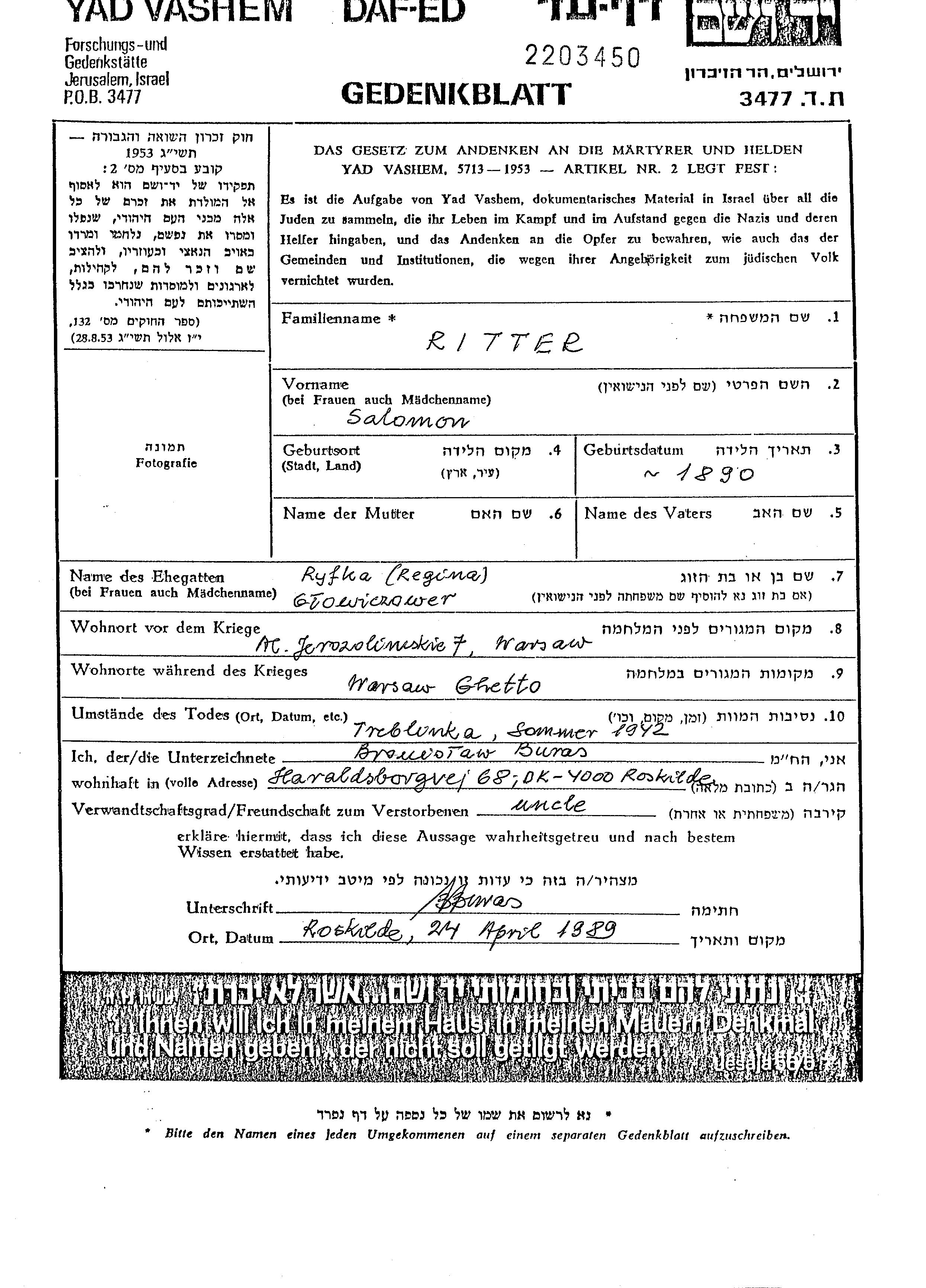Salomon Ritter wurde im Jahr 1890 geboren. Er war mit Ryfka Regina Verheiratet. Vor dem Zweiten Weltkrieg lebte er in Warszawa, Polen. Während des Krieges war er in Warszawa, Polen.