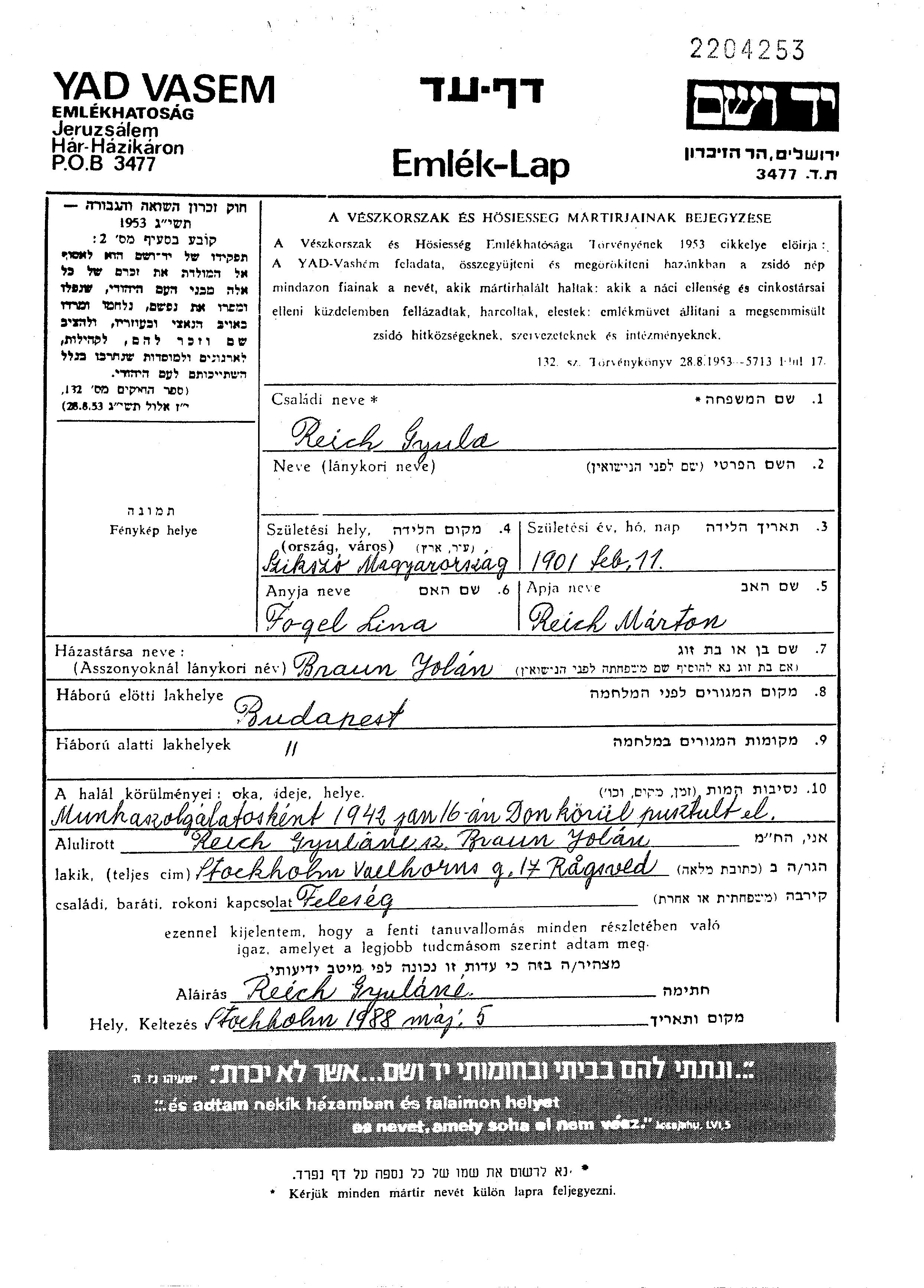 Gyula Reich wurde im Jahr 1901 in Szikszo, Ungarn geboren. Er war der Sohn von Marton und Lina, geb. Fogel. Er war mit Yolan, geb. Braun Verheiratet. Vor dem Zweiten Weltkrieg lebte er in Budapest, Ungarn. Während des Krieges war er in Budapest, Ungarn.