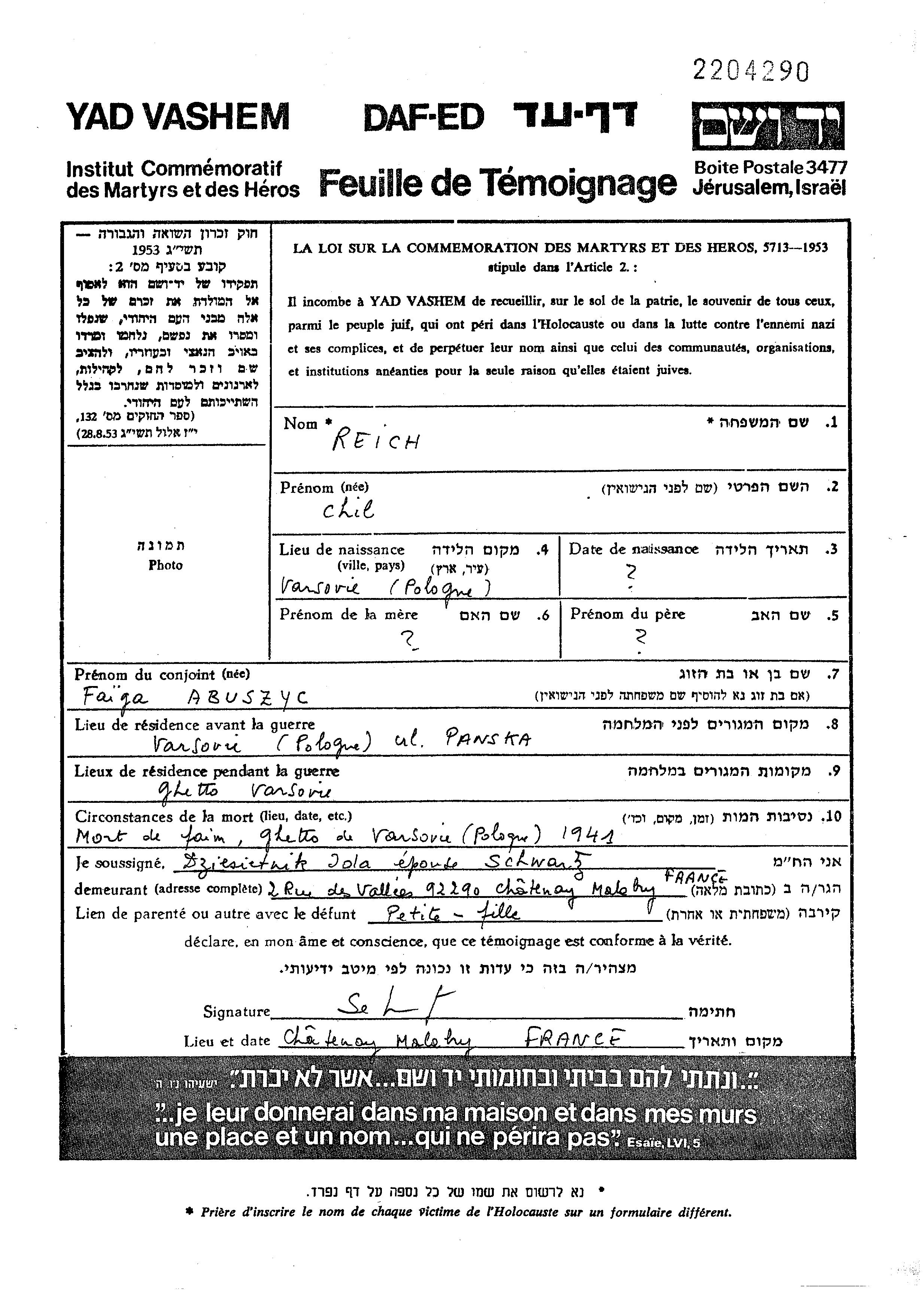 Chil Reich wurde in Warszawa, Polen geboren. Er war mit Faiga Verheiratet. Vor dem Zweiten Weltkrieg lebte er in Warszawa, Polen. Während des Krieges war er in Warszawa, Polen.