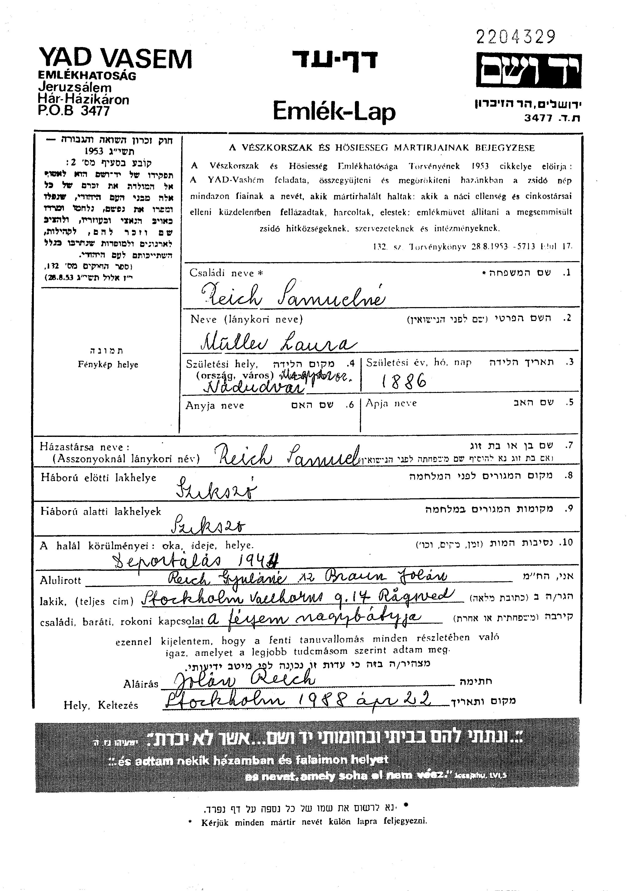 Laura Reich, geb. Müller wurde im Jahr 1886 in Nadudvar, Ungarn geboren. Sie war mit Shmuel Verheiratet. Vor dem Zweiten Weltkrieg lebte sie in Szikszo, Ungarn. Während des Krieges war sie in Szikszo, Ungarn.