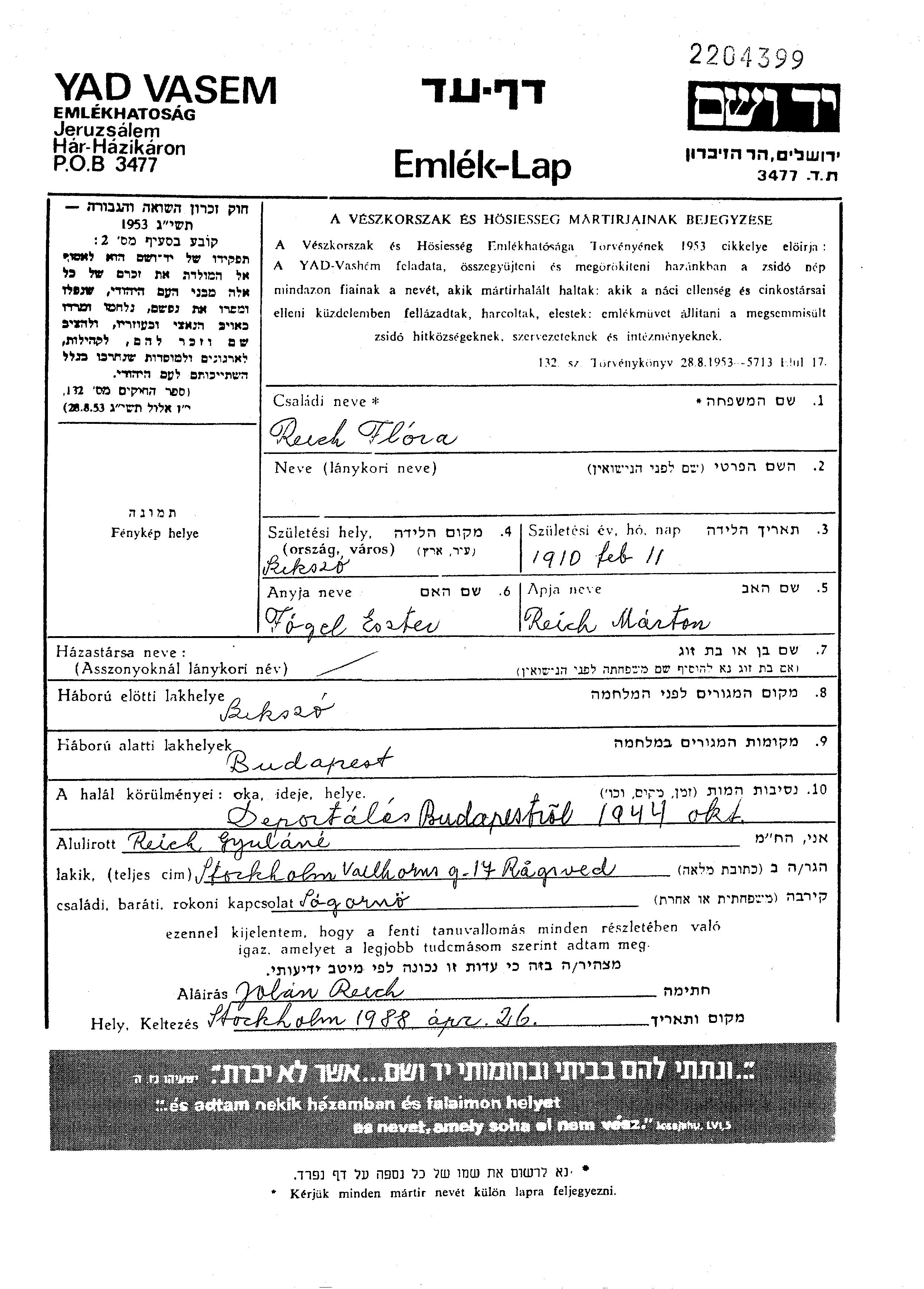 Flora Reich wurde im Jahr 1910 in Szikszo, Ungarn geboren. Sie war die Tochter von Marton und Ester, geb. Fogel. Vor dem Zweiten Weltkrieg lebte sie in Szikszo, Ungarn. Während des Krieges war sie in Budapest, Ungarn.