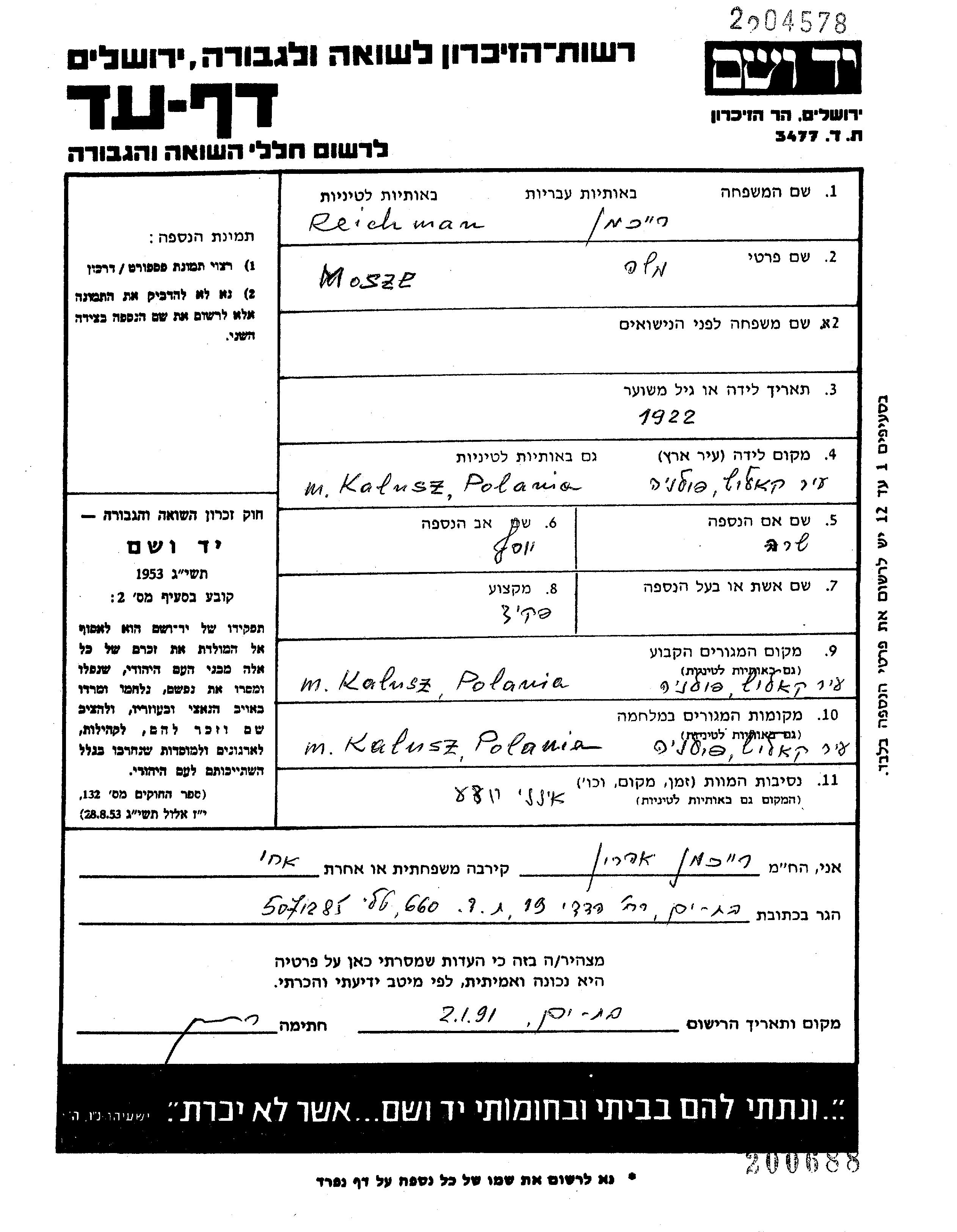 Mosze Reichman wurde im Jahr 1922 in Kalusz, Polen geboren. Er war der Sohn von Yosef und Sara, geb. Fuks. Er war Angestellte/-r. Vor dem Zweiten Weltkrieg lebte er in Kalusz, Polen. Während des Krieges war er in Kalusz, Polen.