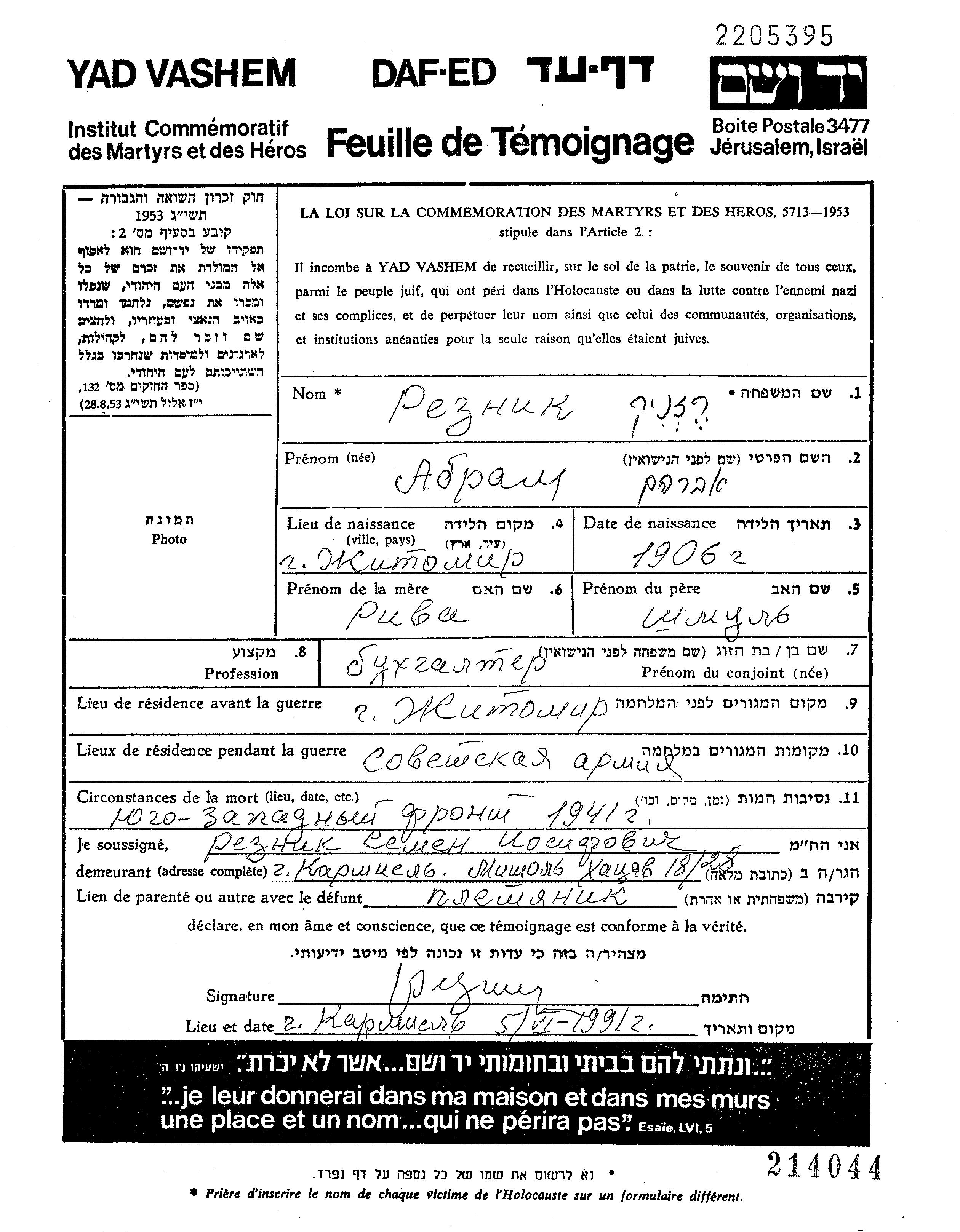 Reznik Abram 1906 Zhitomir, Ukraine (UdSSR) Gedenkblatt