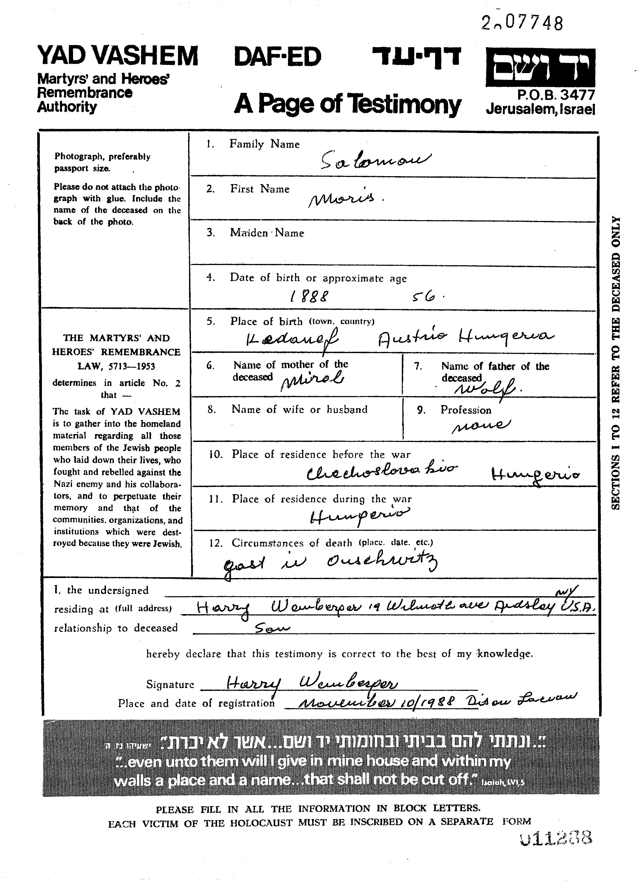 Moris Salomon wurde im Jahr 1888 in Kajdanovo, Tschechoslowakei geboren. Er war der Sohn von Wolf und Mirl. Er war mit Chana Verheiratet. Vor dem Zweiten Weltkrieg lebte er in Tschechoslowakei. Während des Krieges war er in Ungarn.