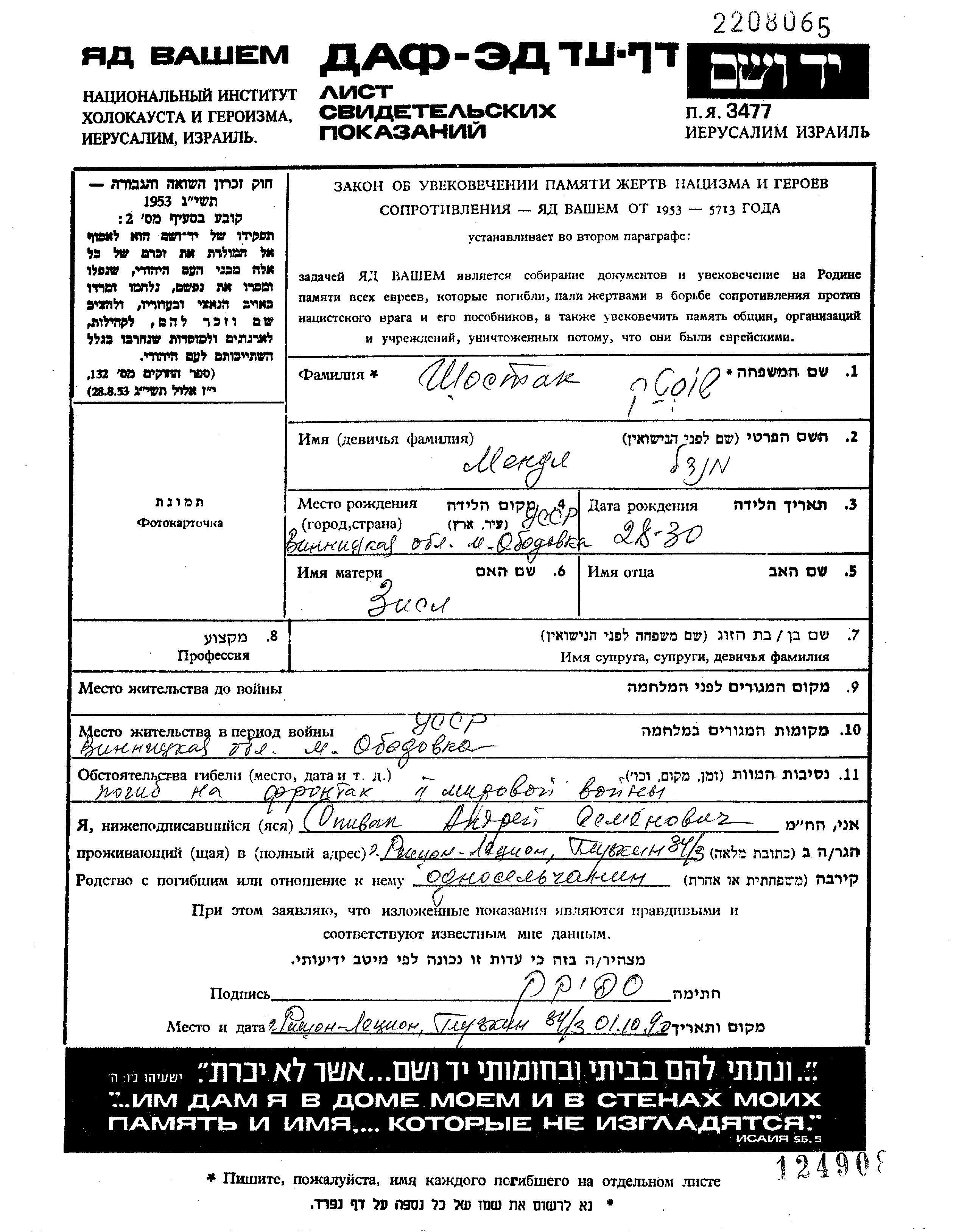 Mendl Shostak wurde in Obodovka, Ukraine (UdSSR) geboren. Er war der Sohn von Zisl. Vor dem Zweiten Weltkrieg lebte er in Obodovka, Ukraine (UdSSR). Während des Krieges war er in die Sowjetischen Streitkräfte.