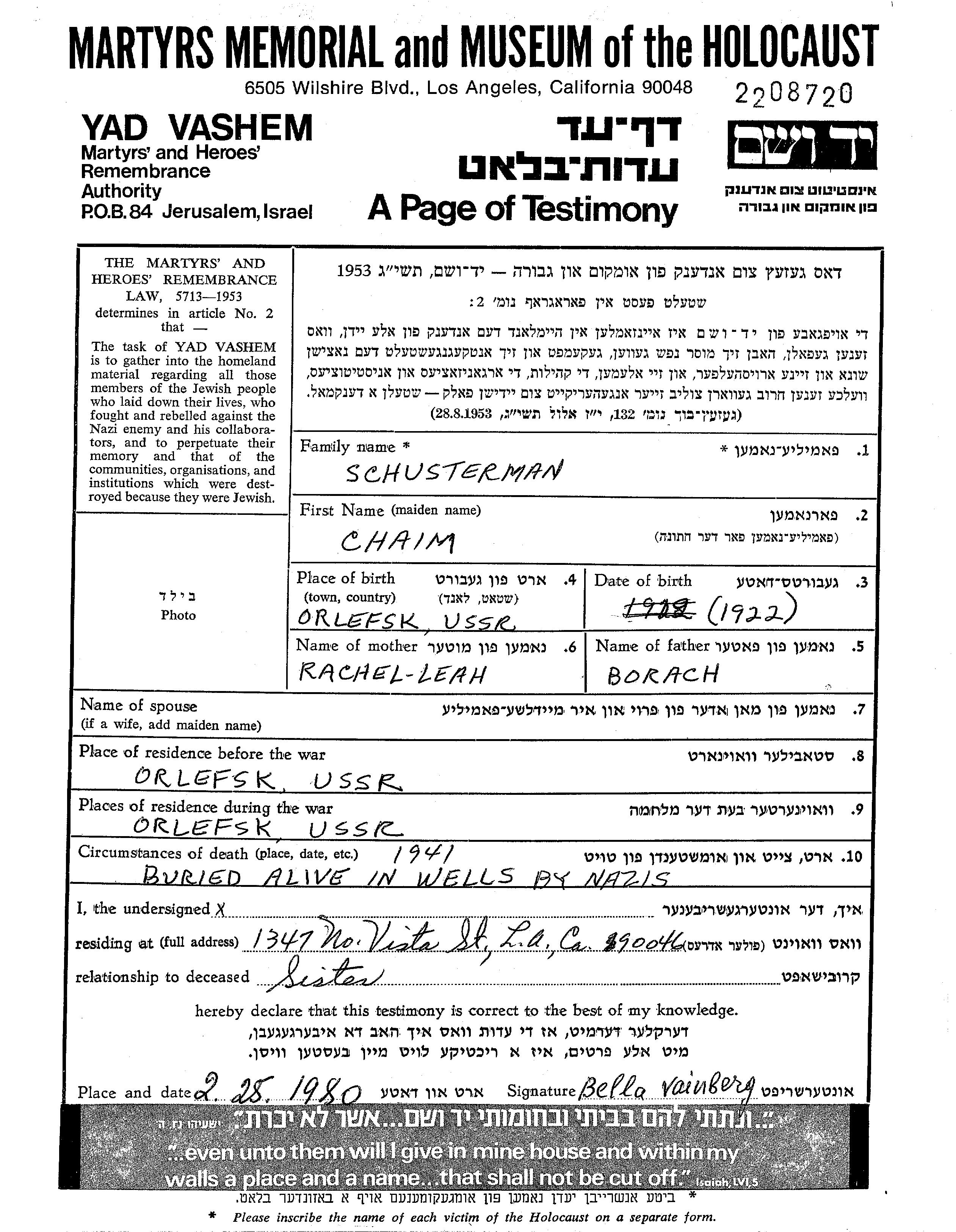 Shusterman Chaim 1922 Olevsk, Ukraine (UdSSR) Gedenkblatt