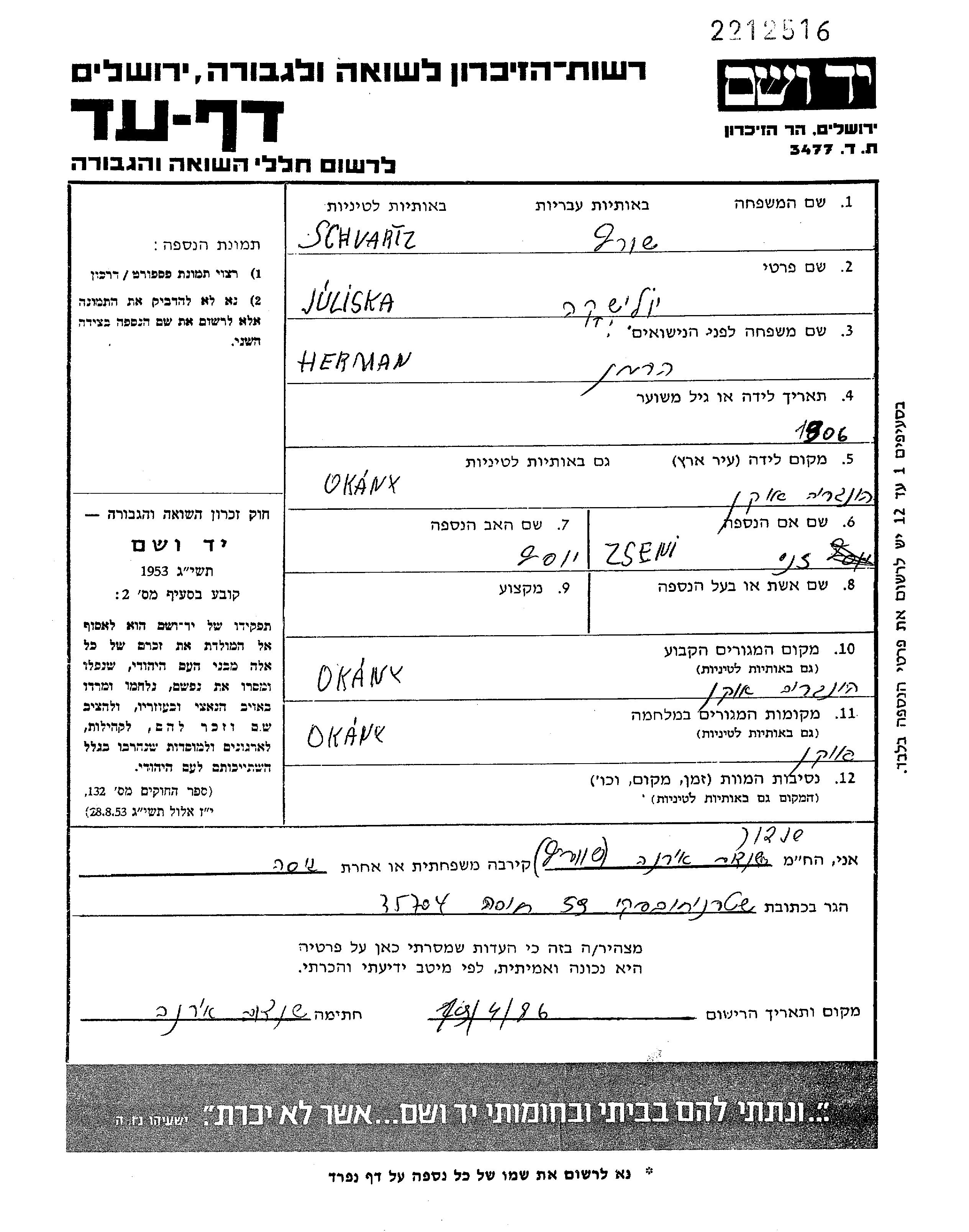 Juliska Schvartz, geb. Herman wurde im Jahr 1906 in Okany, Ungarn geboren. Sie war die Tochter von Yosef und Zseni. Vor dem Zweiten Weltkrieg lebte sie in Okany, Ungarn. Während des Krieges war sie in Okany, Ungarn.