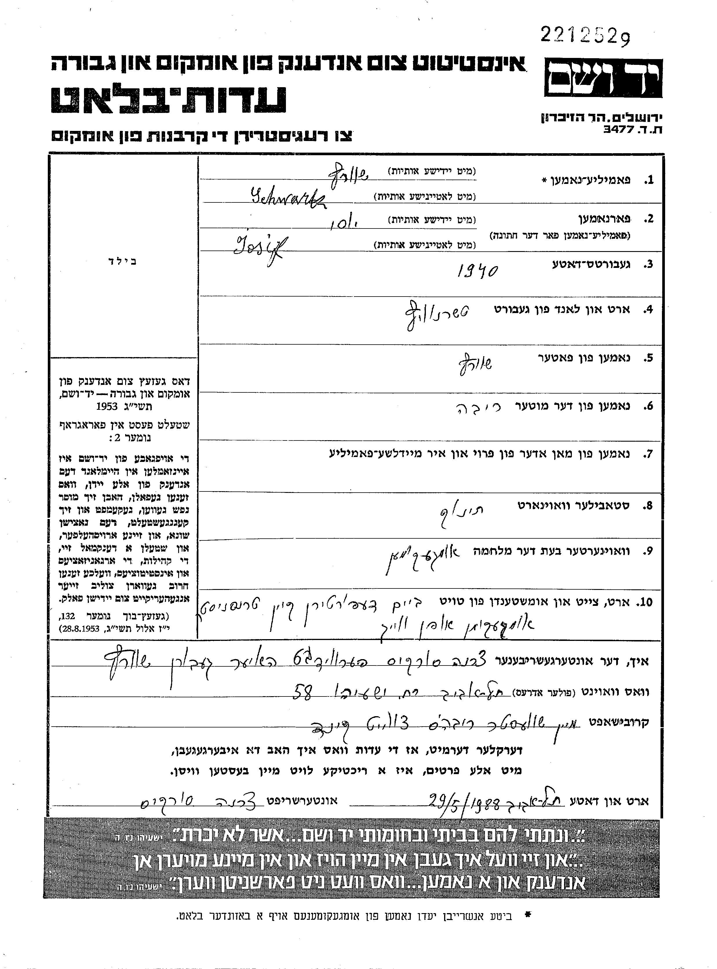 Schwartz Yosi 1940 Czernowitz, Rumänien Gedenkblatt