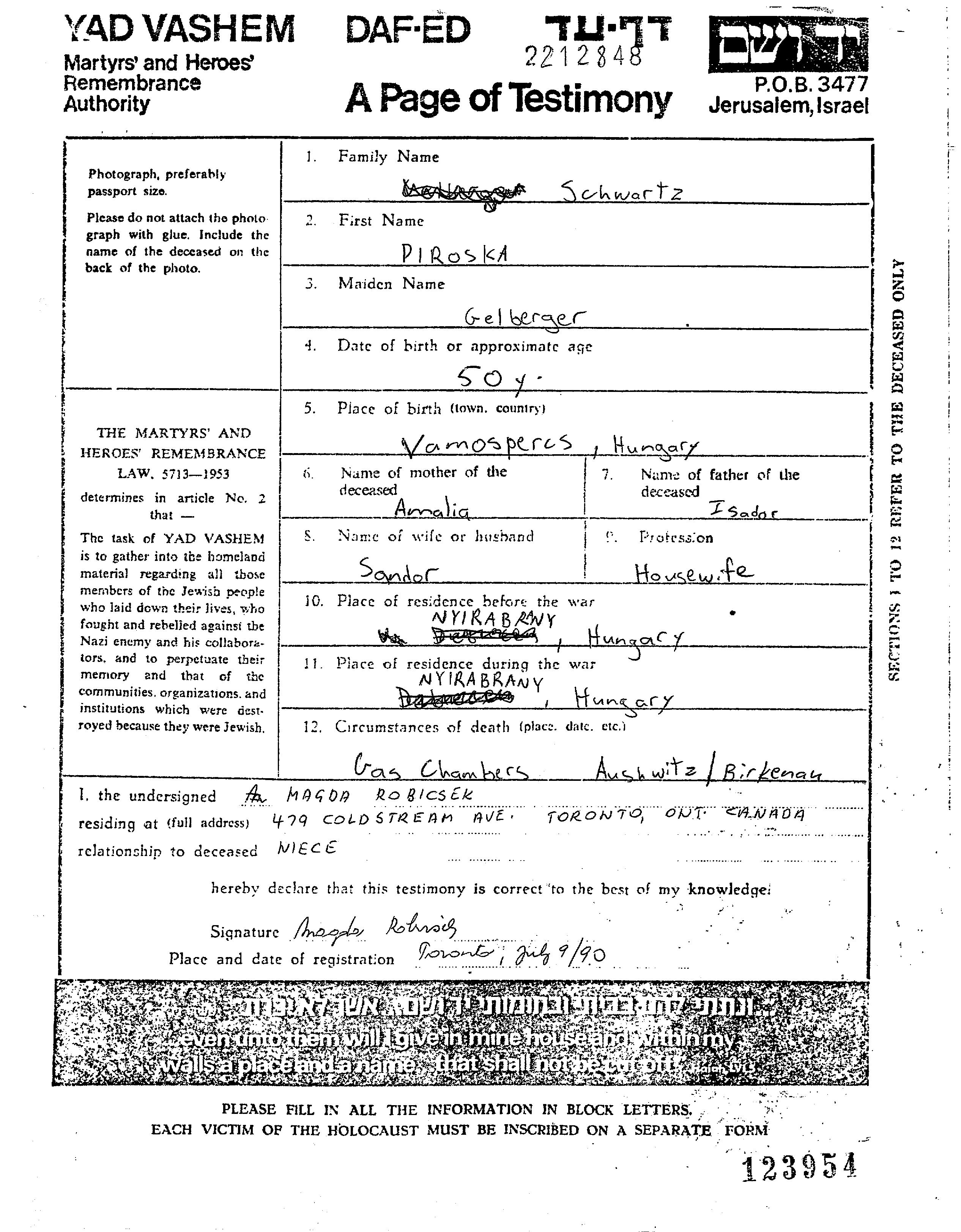 Piroshka Schwartz, geb. Gelberger wurde in Vamospercs, Ungarn geboren. Sie war die Tochter von Isidor und Amalia. Sie war Hausfrau und mit Sandor Verheiratet. Vor dem Zweiten Weltkrieg lebte sie in Nyirabrany, Ungarn. Während des Krieges war sie in Nyirabrany, Ungarn.