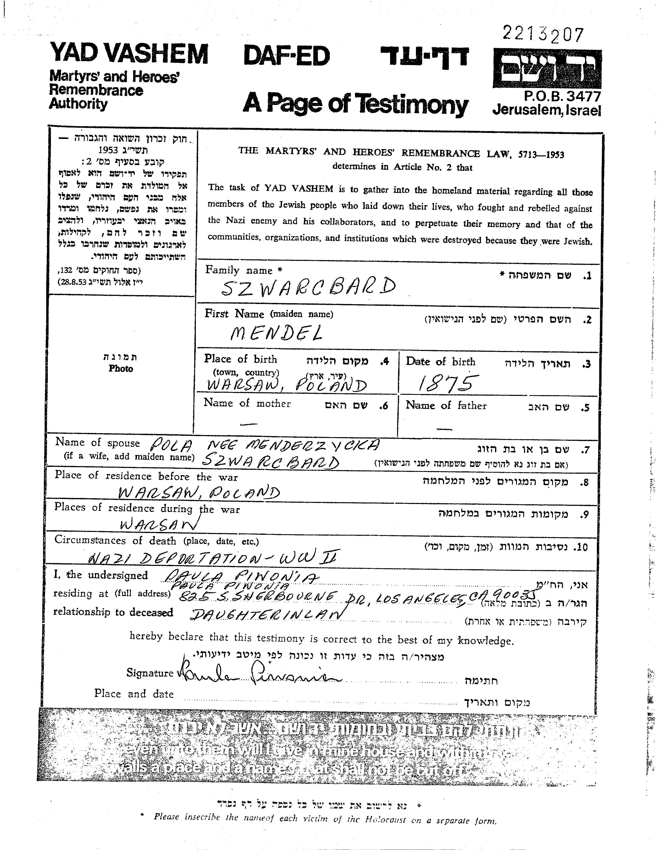 Mendel Szwarcbard wurde im Jahr 1875 in Warszawa, Polen geboren. Er war mit Pesa Pola Verheiratet. Vor dem Zweiten Weltkrieg lebte er in Warszawa, Polen. Während des Krieges war er in Warszawa, Polen.