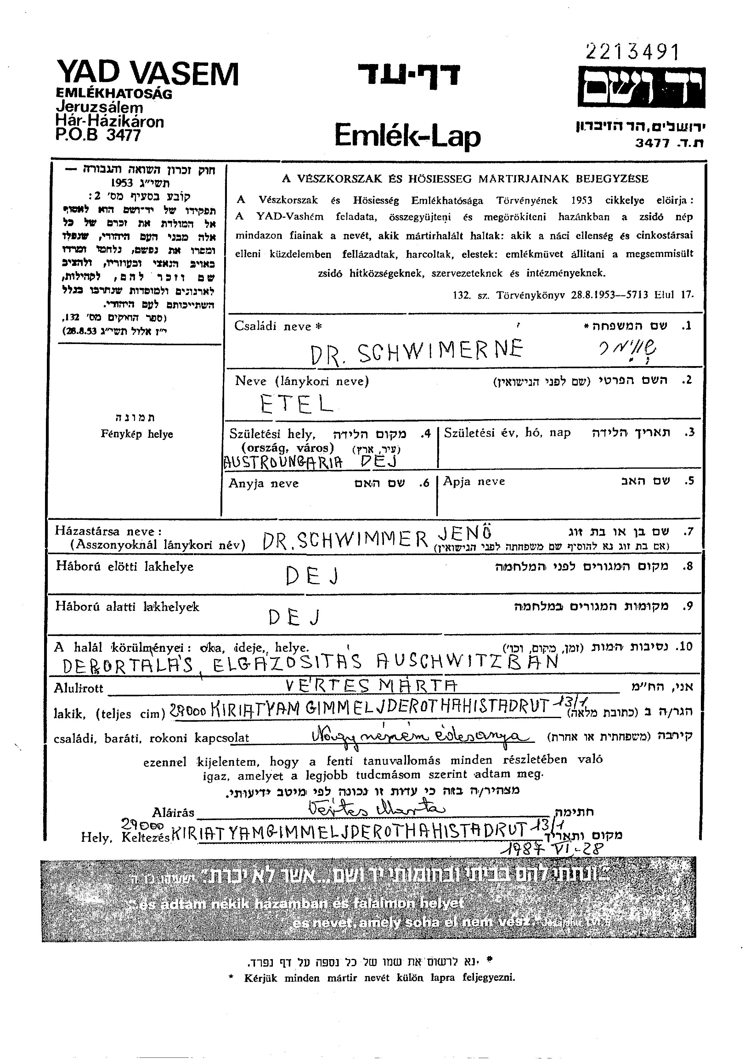 Etel Schwimer wurde in Dej, Rumänien geboren. Sie war mit Jeno Verheiratet. Vor dem Zweiten Weltkrieg lebte sie in Dej, Rumänien. Während des Krieges war sie in Dej, Rumänien.
