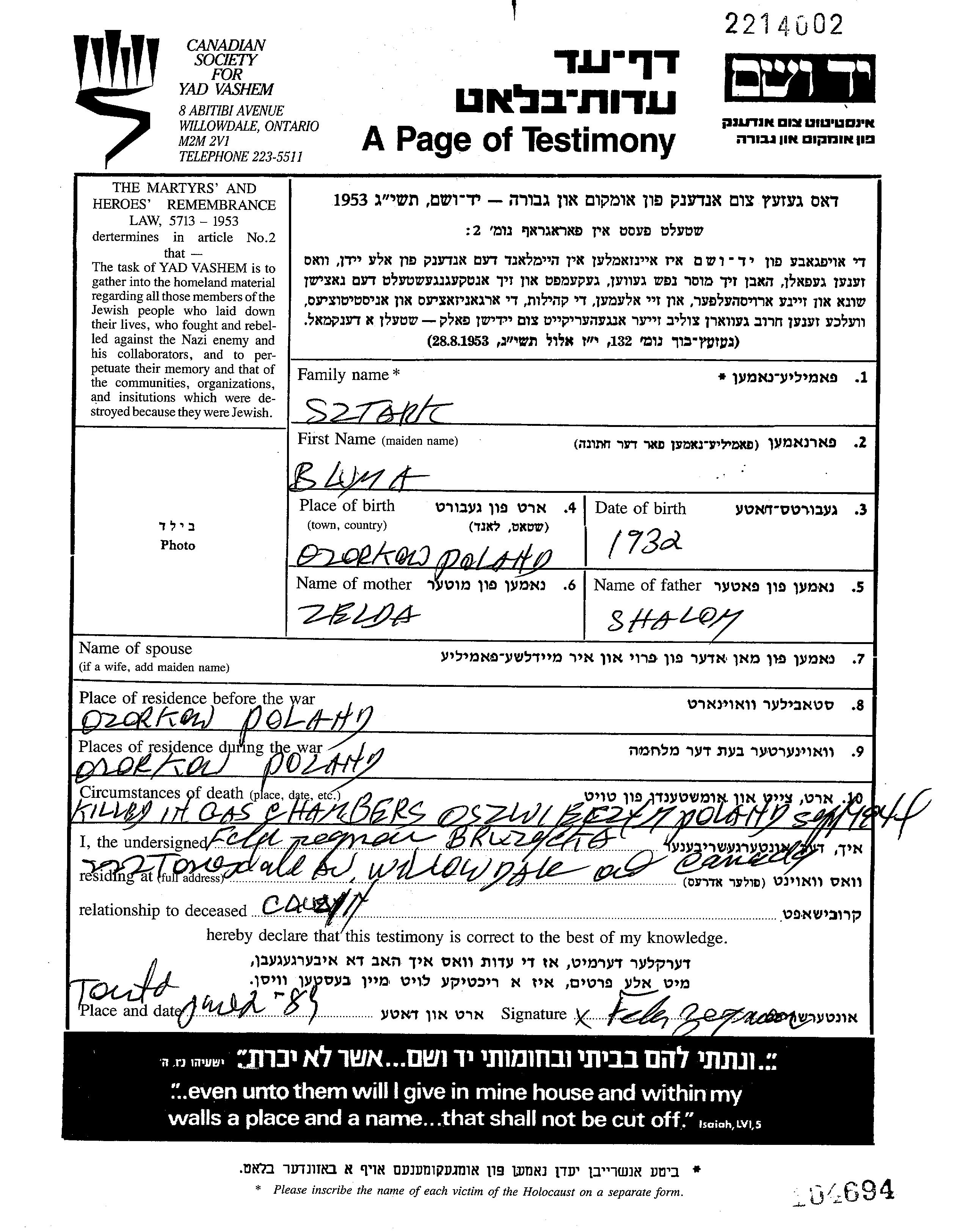 Bluma Sztark wurde im Jahr 1932 in Ozorkow, Polen geboren. Sie war die Tochter von Shalom und Zelda, geb. Waldman. Sie war Schüler/-in und Kind. Vor dem Zweiten Weltkrieg lebte sie in Ozorkow, Polen. Während des Krieges war sie in Ozorkow, Polen.